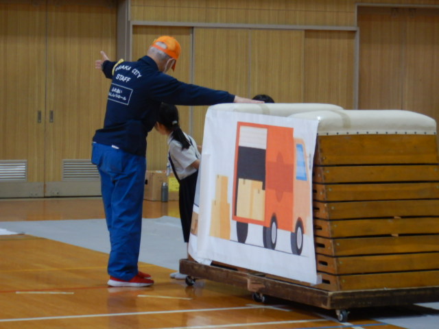阿倍野警察署から映像で道路の歩き方、標識や信号の説明、横断歩道の安全なわたり方を説明したあと、体育館内に横断歩道や信号機を設置し歩道に見立てた模擬道路上を1年生は2人一組、2年生は1人づつ歩く練習をしてもらいました。今日学んだルールは分かっていても実際に守らないと事故につながるので、しっかり守ってくださいとお願いしました。