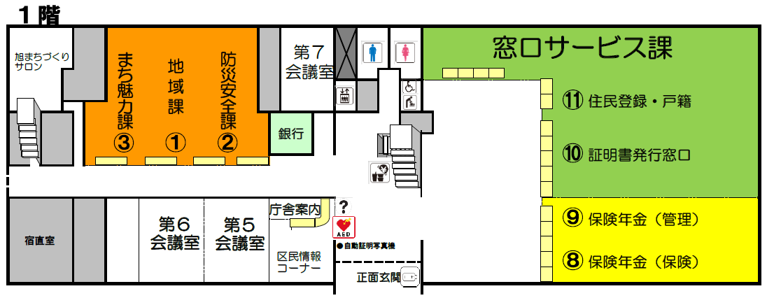 1階(地域課、防災安全課、まち魅力課、窓口サービス課等)