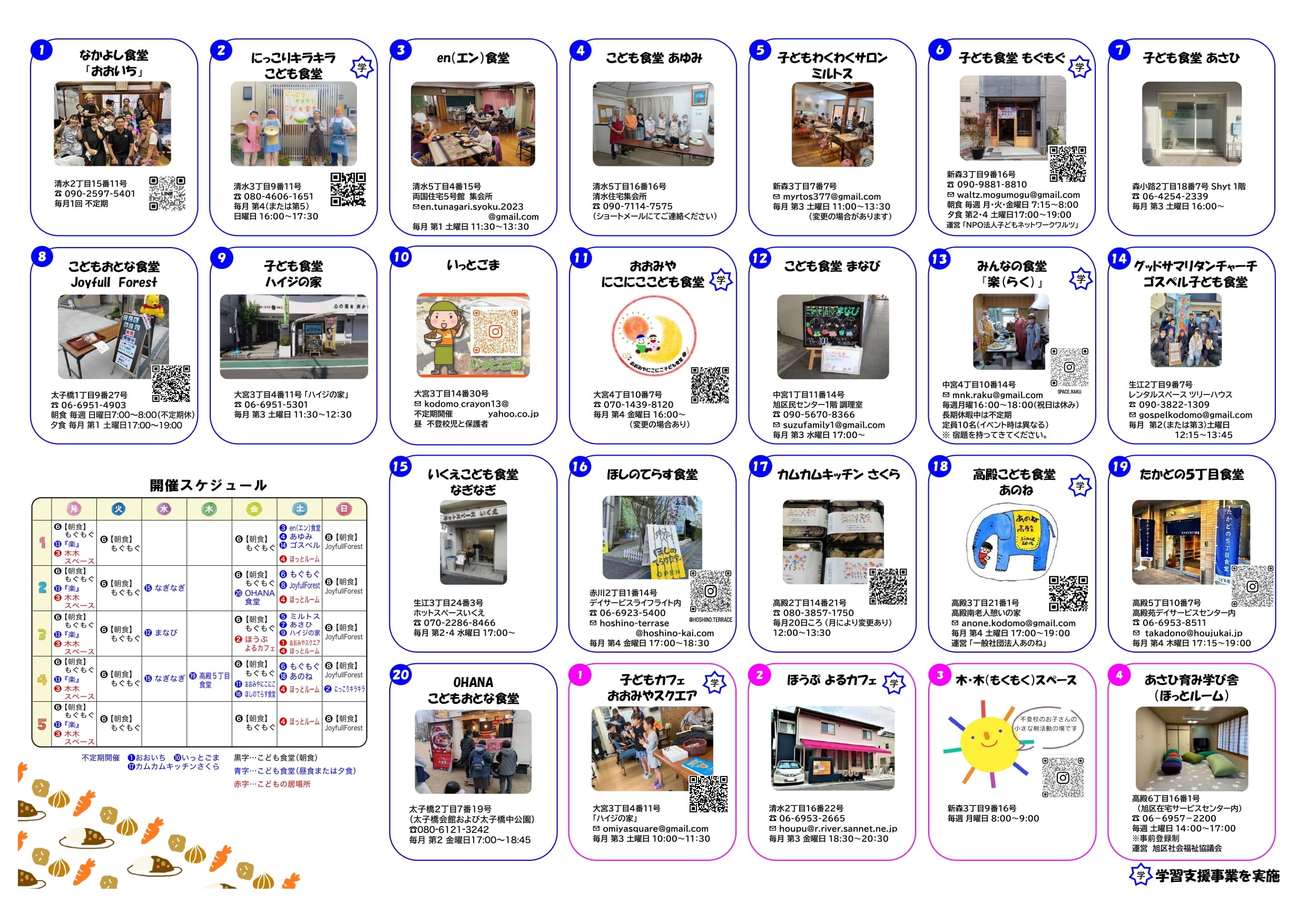 | 子ども食堂 あさひ | 森小路2丁目18番7号 Shyt 1階 | 毎月 第3 土曜日 16:00~ | 06-4254-2339 |