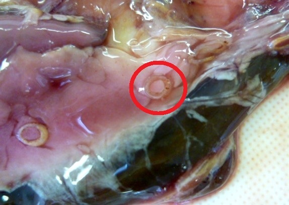 内臓に寄生している時は渦巻き状になっているものが多く、写真のように半透明の粘膜の袋(シスト)に入っているものも見られる。