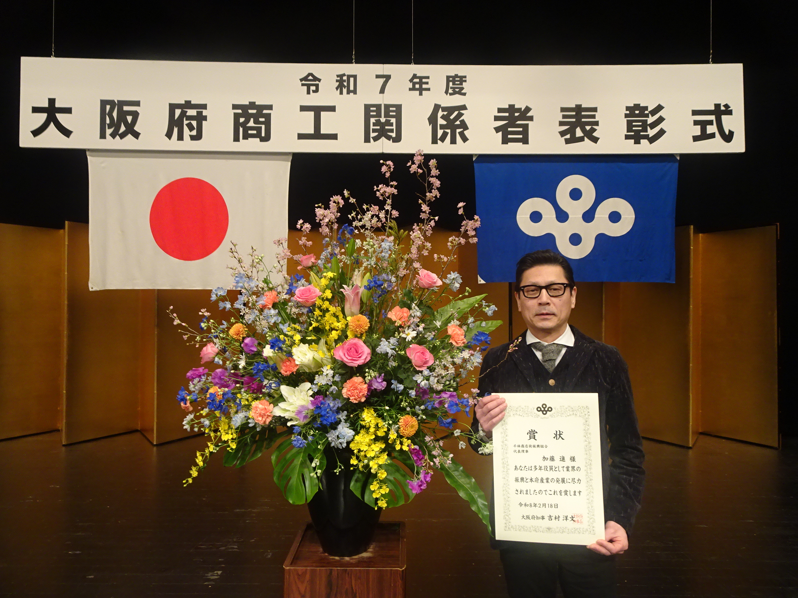 令和8年2月18日(水曜日)に大阪府商工関係者表彰式が執り行われ、千林商店街振興組合、代表理事の加藤進さんが表彰されました。