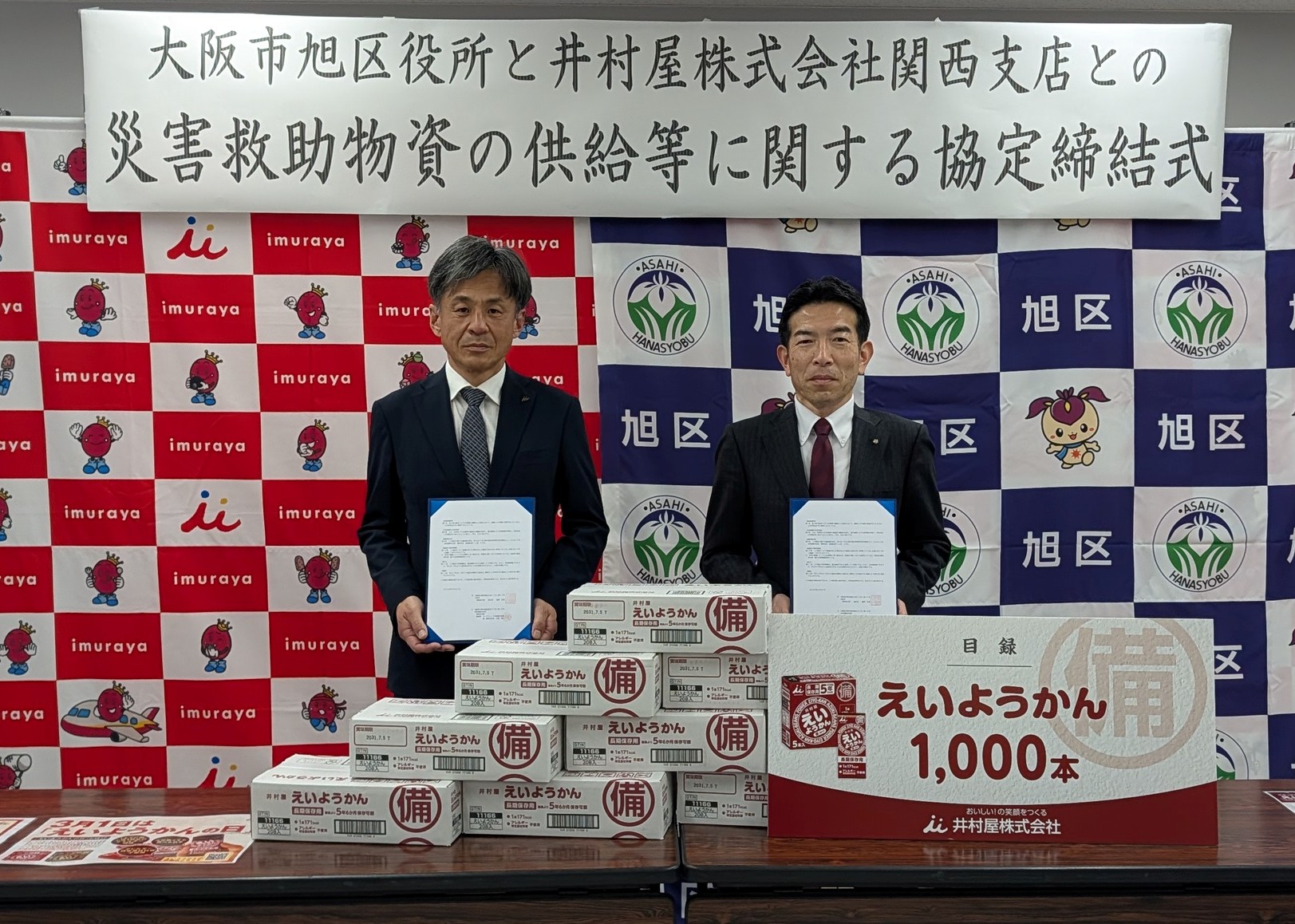 旭区役所では、令和8年2月27日(金曜日)に安全安心なまちづくりを実現するために、井村屋株式会社関西支店と災害救助物資の供給等に関する協定を締結しました。