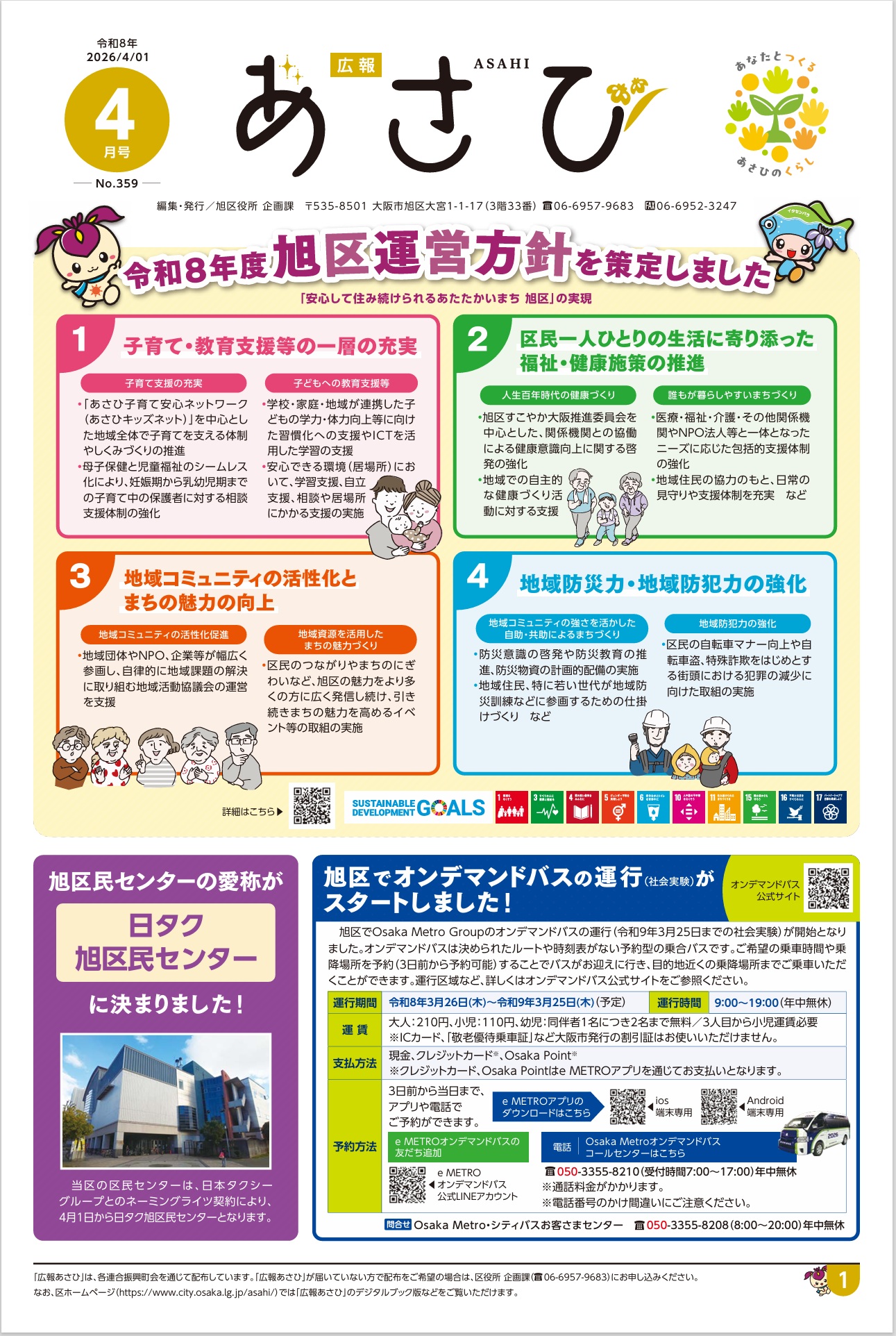 1P 令和8年度旭区運営方針を策定しました、旭区民センターの愛称が日タク旭区民センターに決まりました!、旭区でオンデマンドバスの運行(社会実験)がスタートしました!(PDF形式, 661.28KB)