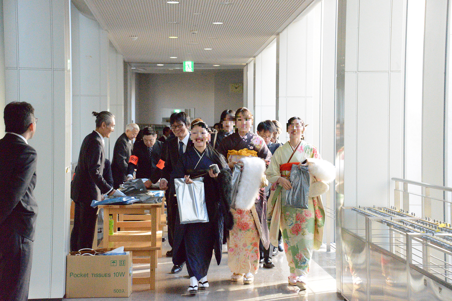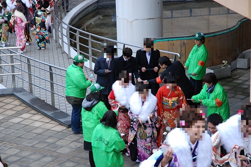 「成人の日の記念のつどい」において新成人を誘導する青少年指導員(緑色のジャケットを着用)