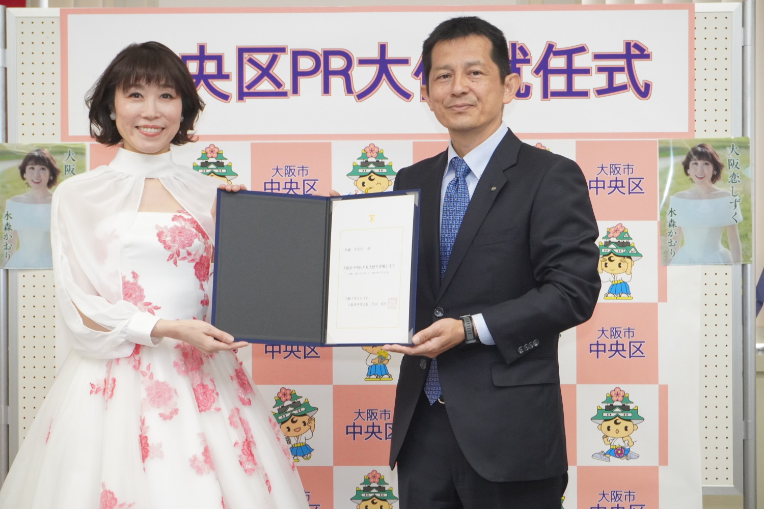 そのような中、今年の新曲「大阪恋しずく」の歌詞やミュージックビデオの中に、中央区にちなむ御堂筋や水掛不動のスポットが出てくることから、今回PR大使を引き受けいただき、委嘱式を迎えることができたことに対して、大きな喜びで一杯です。