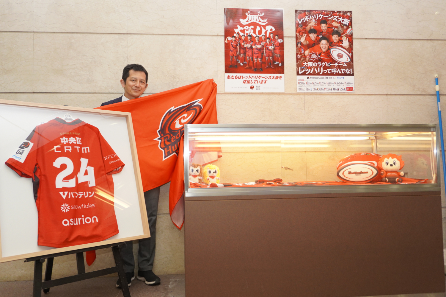 区役所ロビーにレッドハリケーンズ大阪コーナーを設置しています