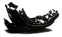 | @There are a lot of small ancient tombs estimated from 300 to 500 around the Nagahara district. The tombs were furnished with such burial mound figures as compared with those of tombs of high-ranked in spite of small scale. Especially in the second Takamawari ancient tomb which is a rounded one of around 21 meters in diameter encircled by a ditch, the largest clay image of a vessel was found, which is 128.5 meters in length, 26.5 meters in width, 36 meters in height and it was designated first among ruins excavated in Osaka City as the important cultural asset. Its scale of the clay image of a vessel leads us to think of full sized article of those days, which is about 15 meters in length, about 3 meters in width, 20`30 tons in weight, scores of men enough to be on board. It is worthy of notice that such a vessel is suitable enough to go abroad overseas and it is just days when 5 Kings of Wa were reigning and beginning to have connection with the Korea Peninsula and the Continent of China. | |||