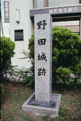 a base. Nobunaga came back over here in a hurry to face them at Tennouji and Ebie district(Osaka City), but he was obliged to retreat to Kyoto because of the additional rise in arms of Ishiyama Honganji Temple. Later Nobunaga took up position here by one of his subordinates to attack the Temples. Now we are not able to trace the remains where it was. Only the local name of Aza reminds us of its whereabouts. |