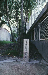 naturally got involved with many conflicts. In the time of the 10th leader of its order named Shonyo(the first year of Tenmon, 1532) the Yamashina Honganji order was attacked by some samurais and the other religious order and burned to ashes. At that time Shonyo took refuge to this place. The following year Shonyo was attacked by the same group of people and 21 persons sacrificed themselves for the protection of Shonyo, who barely survived his life and took refuge to Kishu district(Wakayama Prefecture). The monument describes the incident. The letter of gratitude from Shonyo was left at Enmanji temple nearby with the monument for the repose of the dead. |