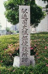 Osaka, Kyoto and Tokyo. Here is the site of Post Office (the warehouse of the Shimabara clan in the era of Edo). It was equal to the Central Post Office of today. The mailbox was also set up and 53 letters was dropped onto it for the first 3days and it took about 75hours for them to get to Tokyo. |