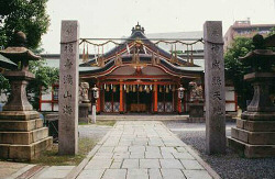 enshrined. The shrine has little historical records because of its suffering from war. The building was reconstructed in the 8th year of Keicho(1603) by Toyotomi Hideyori, but burned down by the Summer Siege. Only the stone torii, a gateway at the entrance, survived now. The shrine had faced a sharp cliff, commanding a fine view, opening toward the east, and the area had been undulating. The Osaka citizens carried earth and sand got by dredging a river to the shrine to make the land flat, “Sunamochi”(carrying sand) in the first year of Kansei(1789). The shrine was crowded with men and women of all ages in matching kimonos gathering here for about a month. In addition, this area was the site of tamatsukuribe's residence who made the ancient magatama, or comma shaped beads. |