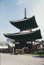 the former self of this temple. The temple is dedicated to the Aizen-myoo(the God of love) called Aizen-san. The Aizen Festival traditionally marks the beginning of the summer festival season in Osaka, crowded with people to see a parade of palanquins named Hoekago. The Tahoto, the pagoda of treasures, in the precincts was constructed in the early years of Keicho(about 1600). It is one of the largest pagodas in this country and only one building what is left in Osaka constructed in the Momoyama period(an important cultural property). |