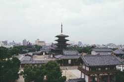 in the era of Asuka. The arrangement of the buildings in which the Nandaimon(Great South Gate), Chumon(Central Gate), Pagoda, Kondo(Main Hall), and Kodo (Lecture Hall) stand together in a straight line is known as the gShitennoji Cathedral Styleh. According to the late investigation by excavation, the arrangement of those buildings remains almost the same from the time of its foundation. Although the temple often suffered disasters, the stone Torii at the west gate, which was the oldest building in the temple, was erected in the 2nd year of Einin(1294) and other buildings such as Honbo-hojo(Main Building used for a chief priest), Rokujido(the place for religious services conducted 6times in a day), that were erected in the 9th year of Genna(1623), survive natural and war disasters. The temple holds 6 national treasures including gSenmen Hokkekyo Sassih and many items of important properties. The gShoryoe Bugakuhoyoh which is the great ritual service conducted on the Ishibutai(the stone stage) takes place annually on the 22nd of April and is designated as an important incorporated cultural property. @ | |
