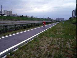 and so on. Osaka City is providing the citizens on a large scale with roads for recreation and cycling. The road for cycling around the northern Osaka has been accomplished 20km long from the Nakanoshima park to the Bankokuhaku memorial park and is made good use of by many citizens. The construction for providing the Naniwajitenshado (Naniwa road for bicycles) is now going on and a part of it has already been accomplished. The course of it is running from the north end of the Akagawa iron bridge of the JR Jotokamotsu line toward the upper stream by way of the right bank (north bank) of the Yodogawa river to the Jakkoji temple and the sluice of the Kanzakigawa river and from there running to Dekijima, Nishiyodogawa-ku, national road Route 43 by way of the left bank (the south bank) of the Kanzakigawa river toward the lower stream, which is 21.6km long. The course of it is situated to run from the east to the west of the northern part of Osaka and you are able to make a tour of the historic scenes effectively along the course. |