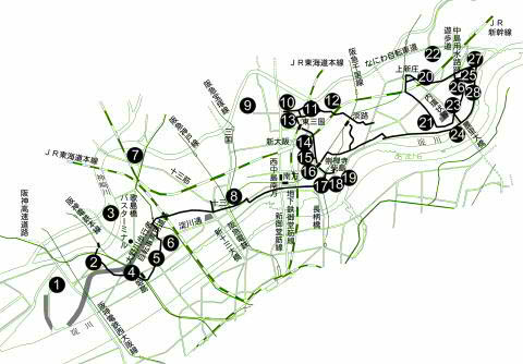 淀川・江口コースには、淀川と深いかかわりをもった歴史を秘める地域を廻ります。平安時代末期から鎌倉時代にかけて京都まで船で往来した人々で賑わった江口。ここでは当時の繁栄と、西行の妙女の一夜の語らいを偲び、その後は江戸時代以降の治水と利水に非常に大きな役割を果たした中島大水道跡めぐり。その他、旧街道の風情を残す道筋や街並、崇禅寺付近の史跡や伝説に思いをはせ、あるいはかつての水上交通の舞台であった淀川堤防からの眺望を楽しみ、また緑あふれる大野川歩行者自転車専用道路を散策するなどバラエティに富んだ楽しみかたができます。 |