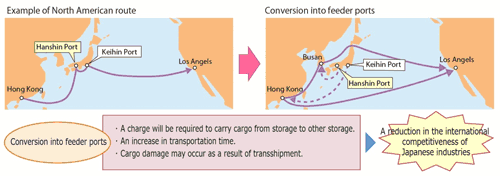 Because other Asian ports are making remarkable progress, the relative competitiveness of ports in Japan is being gradually compromised. If our key ports would be excluded from the major routes of marine container transport, the ports in Japan would function only as feeder ports for transshipment to foreign ports (such as Busan).