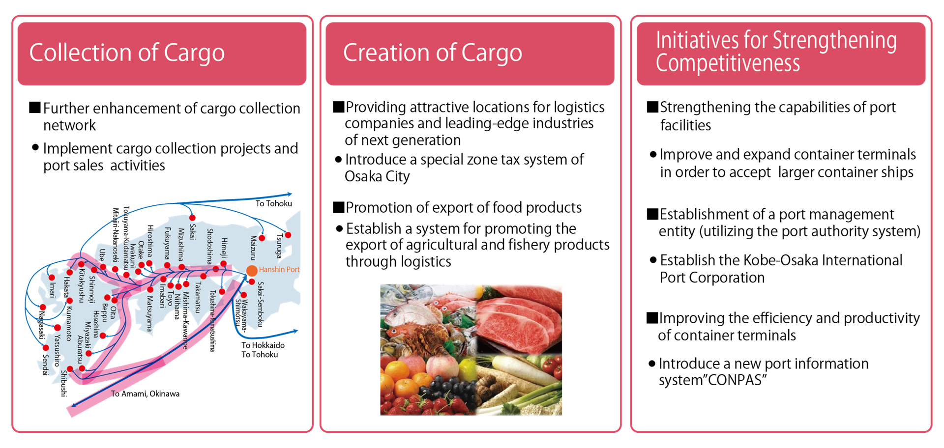 The specific initiatives include the collection of cargo, the creation of new cargo by encouraging the establishment of new industrial sites, and the strengthening of competitiveness by improving the capabilities of port facilities.