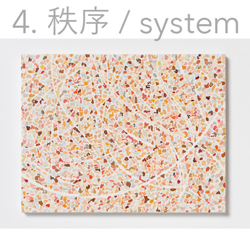 本展では、2025 年以降に制作した新作を中心に、"1. 輪 / circle、2. 知覚 / perception、3. 火 / fire、4. 秩序 / system"というテーマごとに作品を紹介します。真っ白な地に、形や色がどのように選ばれ、増殖し続けるのか。1人の画家の思考の変遷を辿る展覧会です。