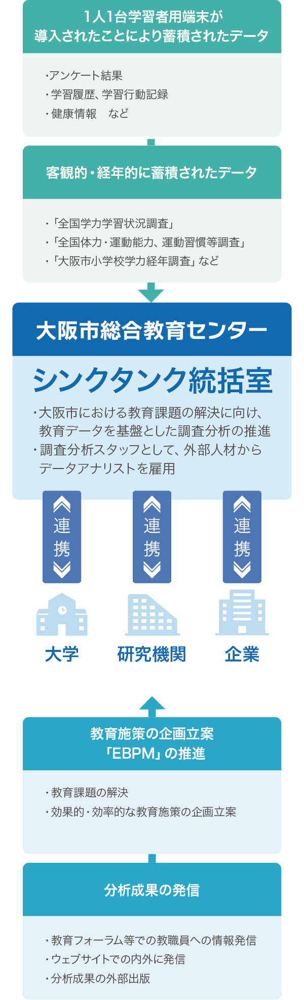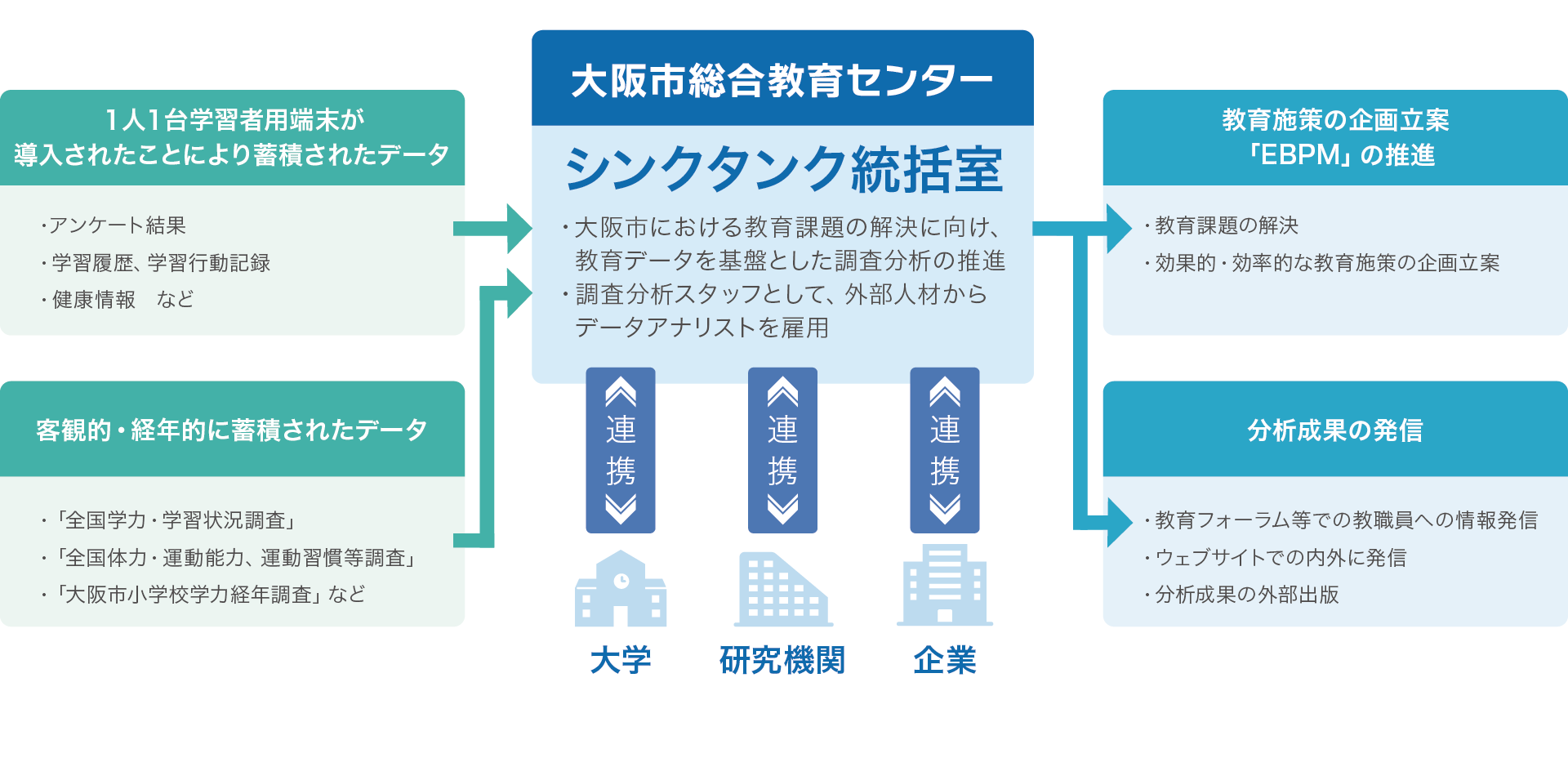 大阪市における教育課題の解決に向けて、1人1台学習者用端末が導入されたことにより蓄積されたデータや全国学力・学習状況調査などの客観的・経年的に蓄積されたデータを活用し、外部人材からデータアナリストを雇用し調査分析を進める「シンクタンク統括室」を設置いたしました。シンクタンク統括室では、大阪市教育振興基本計画に掲げる最重要目標達成に資する調査分析を行います。