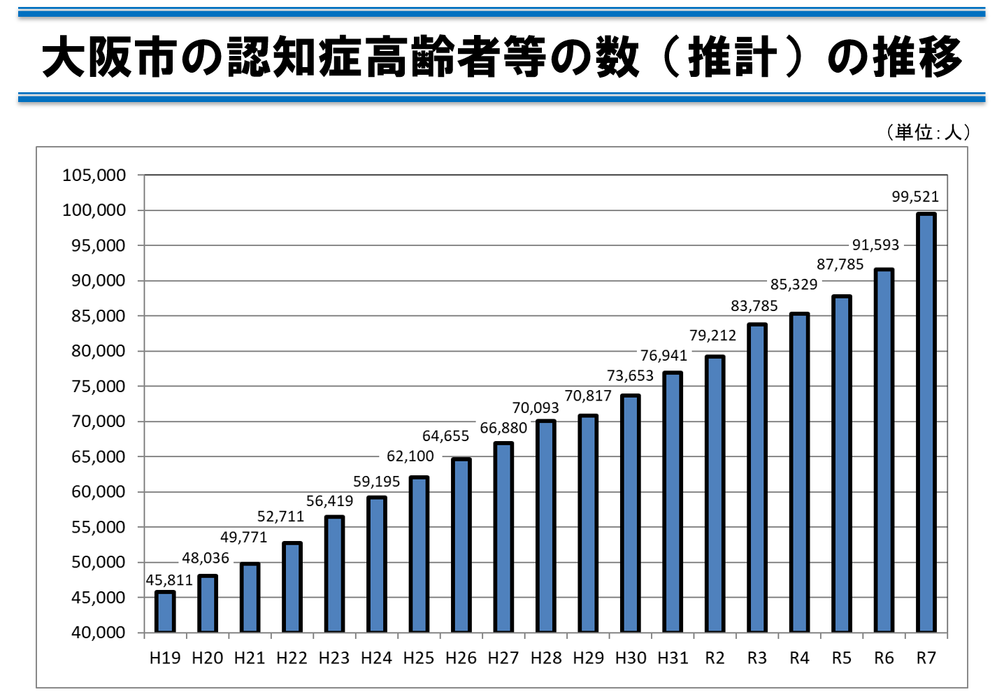 大阪市の認知症高齢者等の数は、長寿化の影響に伴い、増加が続いています。