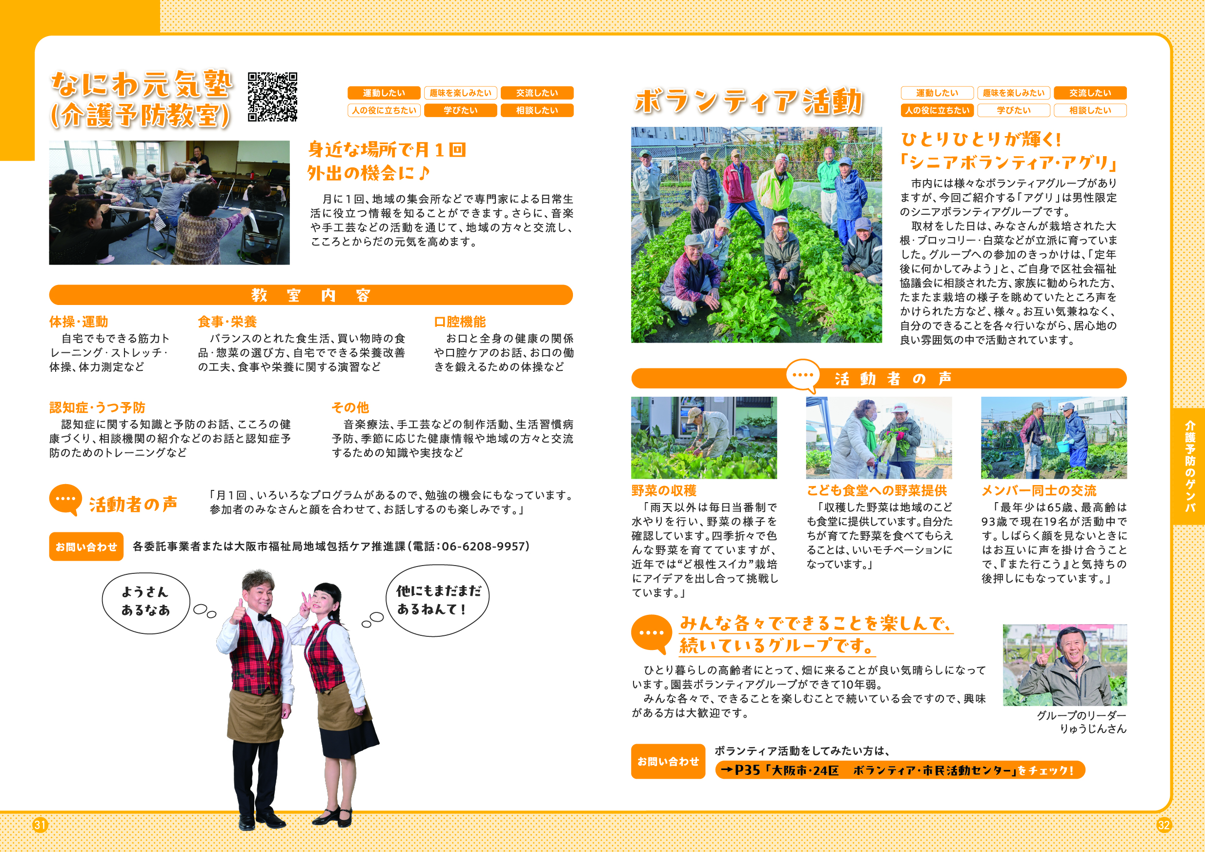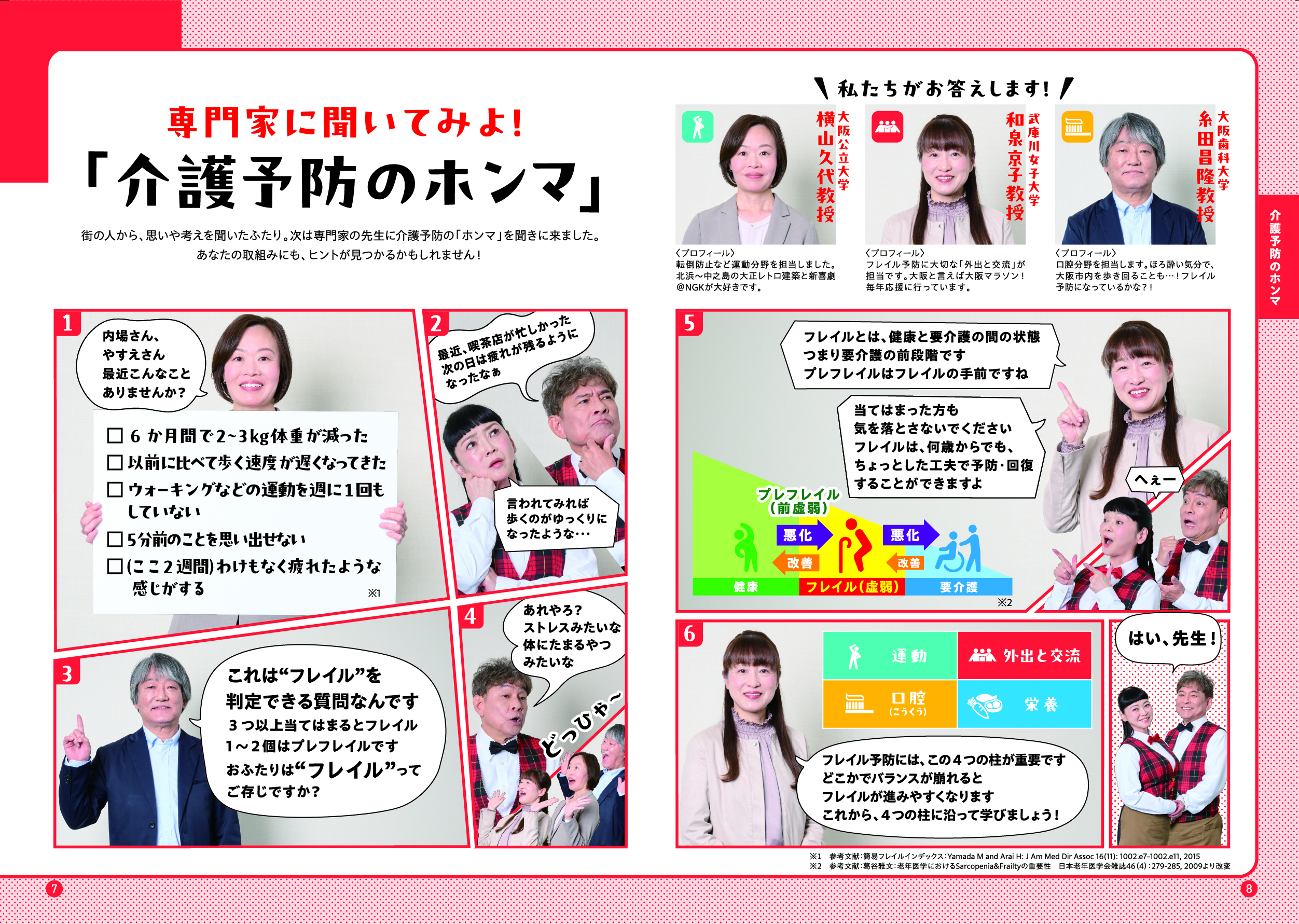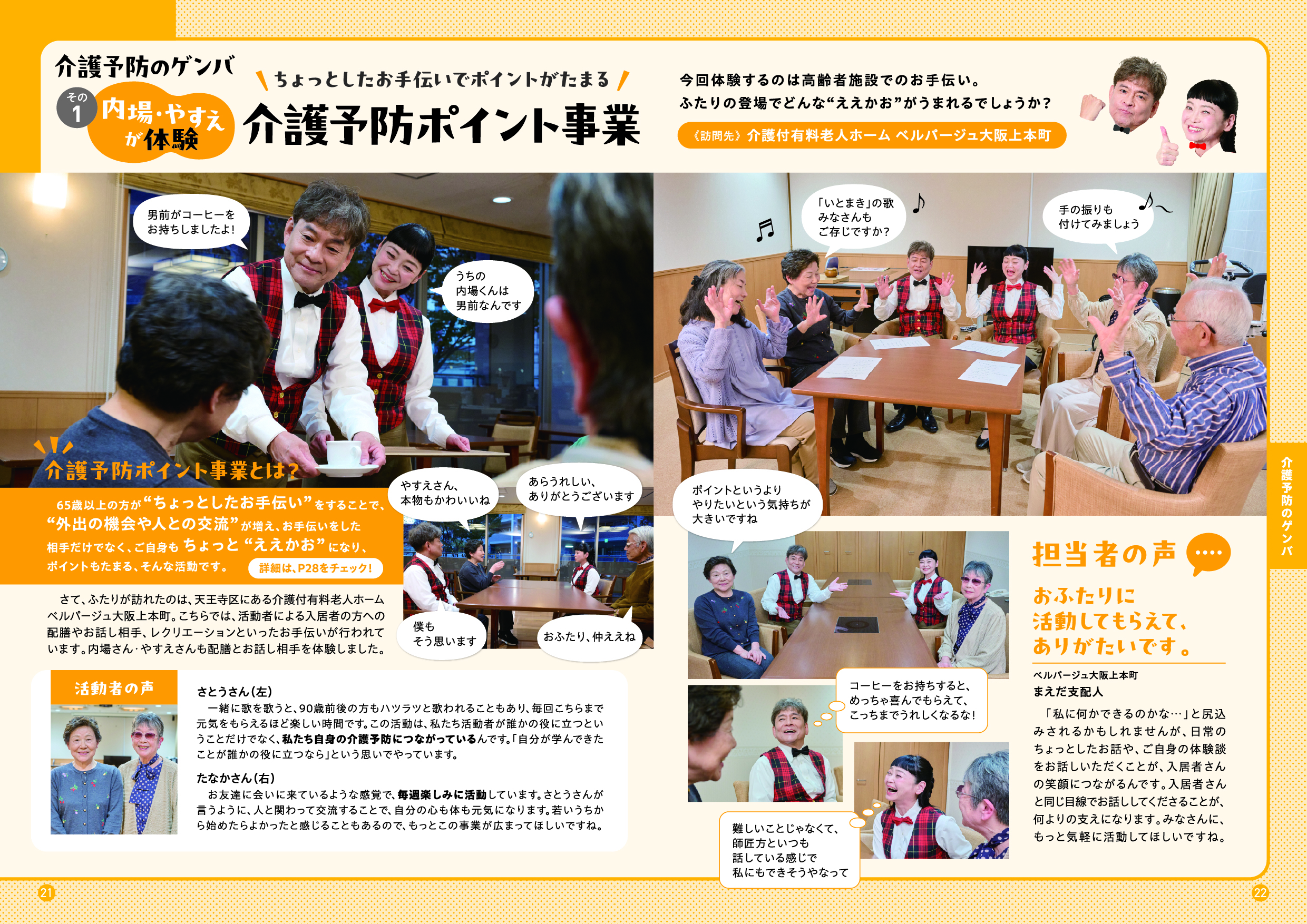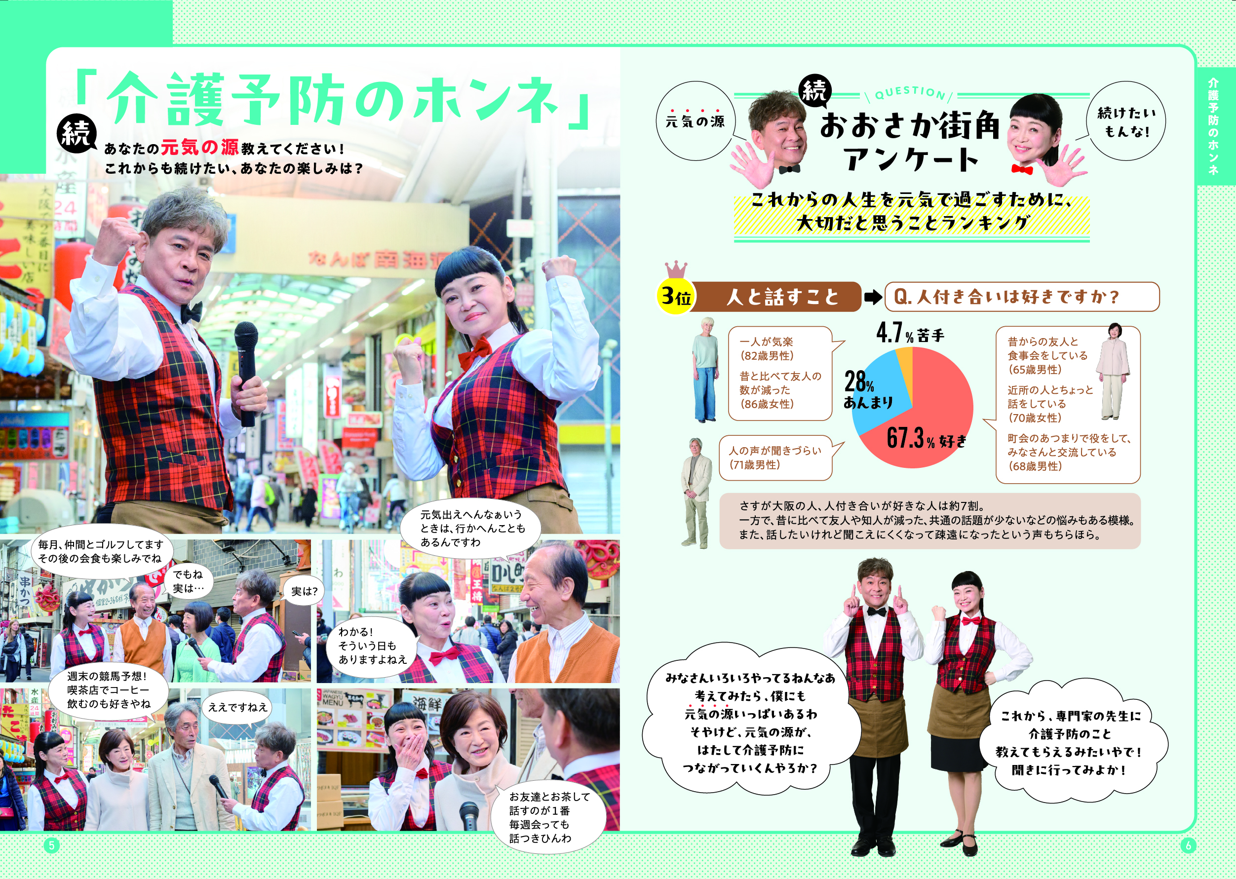 このガイドブックでは、「大阪市介護予防アンバサダー」である吉本新喜劇の内場勝則さんと未知やすえさんが、介護予防についての街角インタビューや、専門家との対談を通じて、介護予防の大切さをわかりやすくご紹介しています。また、皆さんに参加いただける介護予防活動の場もご紹介しています。アンバサダーと一緒に、楽しみながら、ご自身にあった活動を見つけていただき、介護予防について考えていただける内容となっていますので、ぜひ最後までご覧ください。