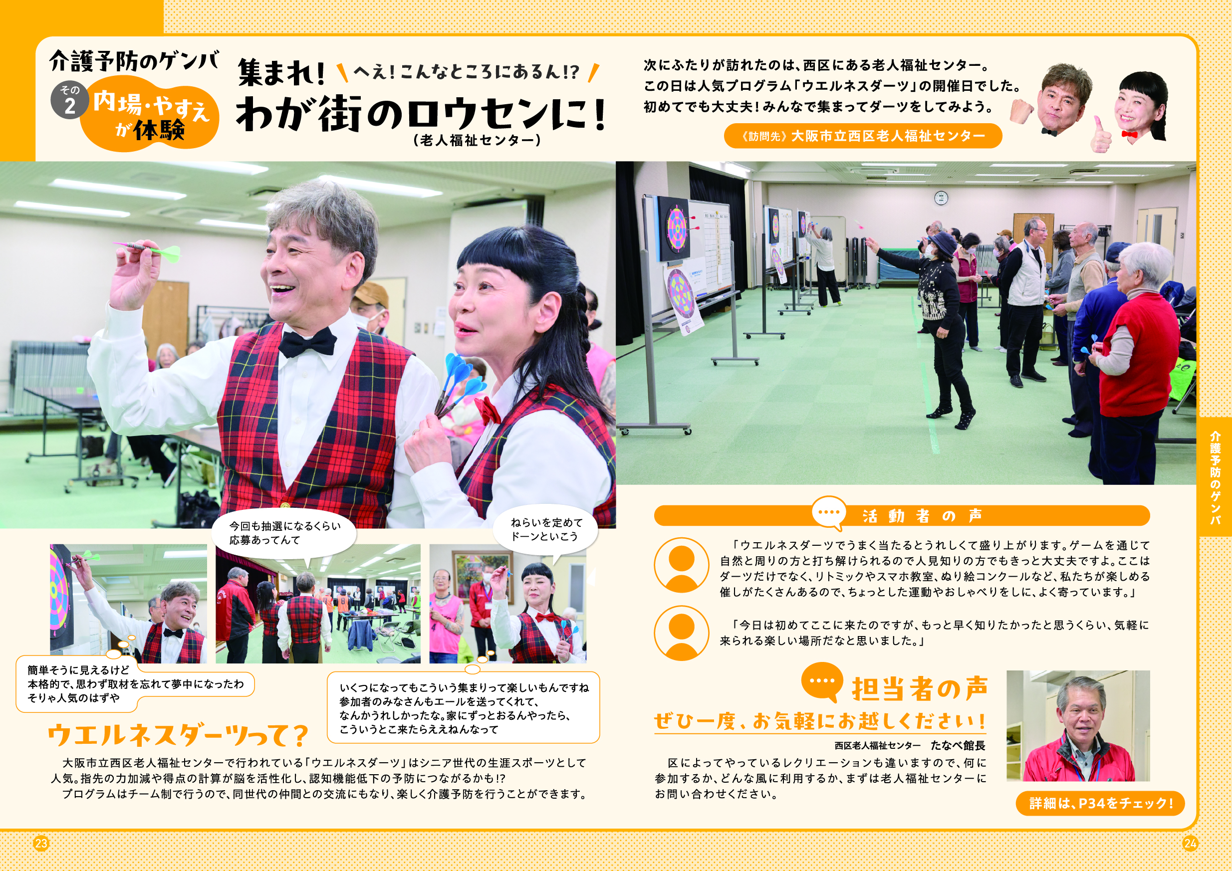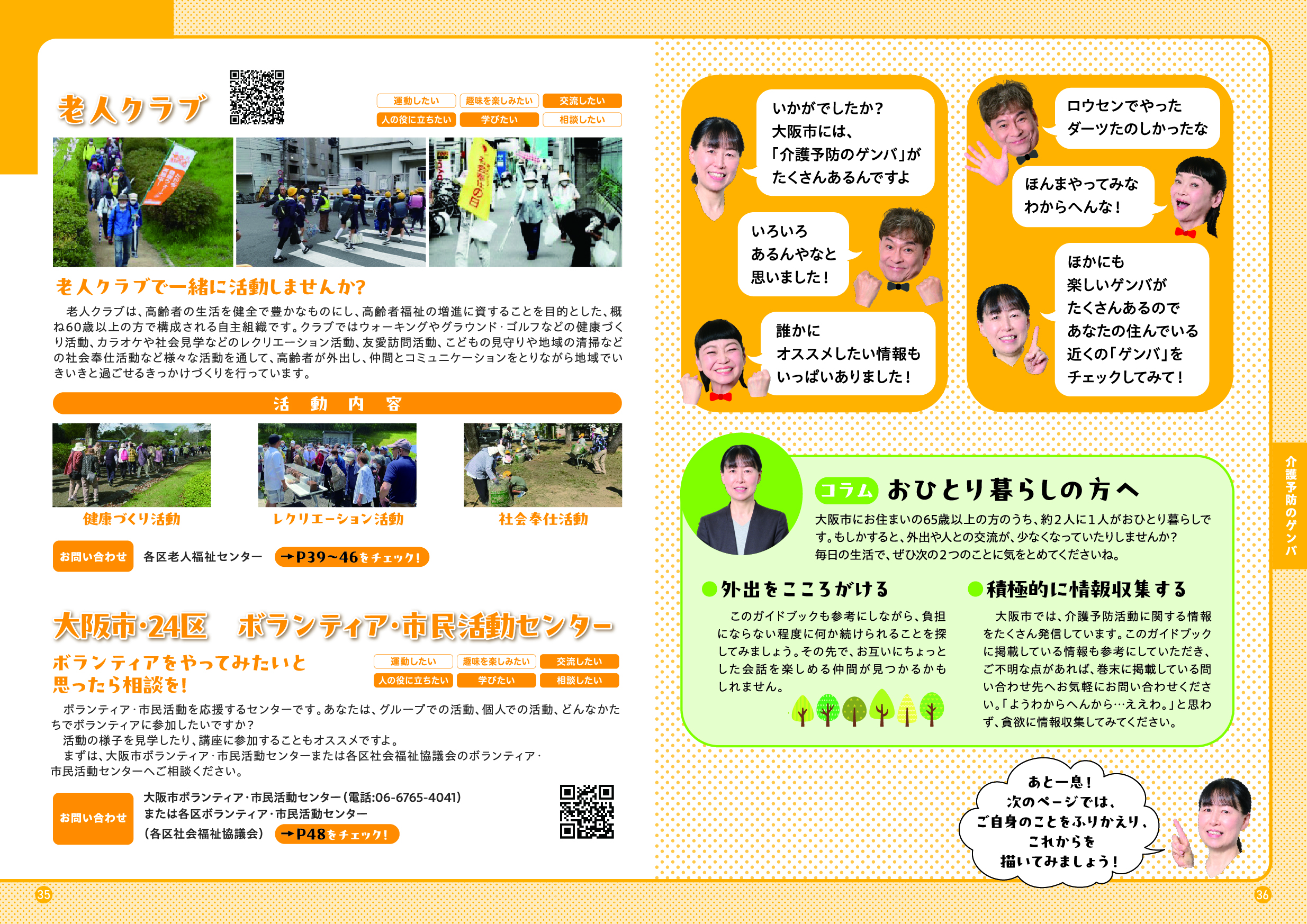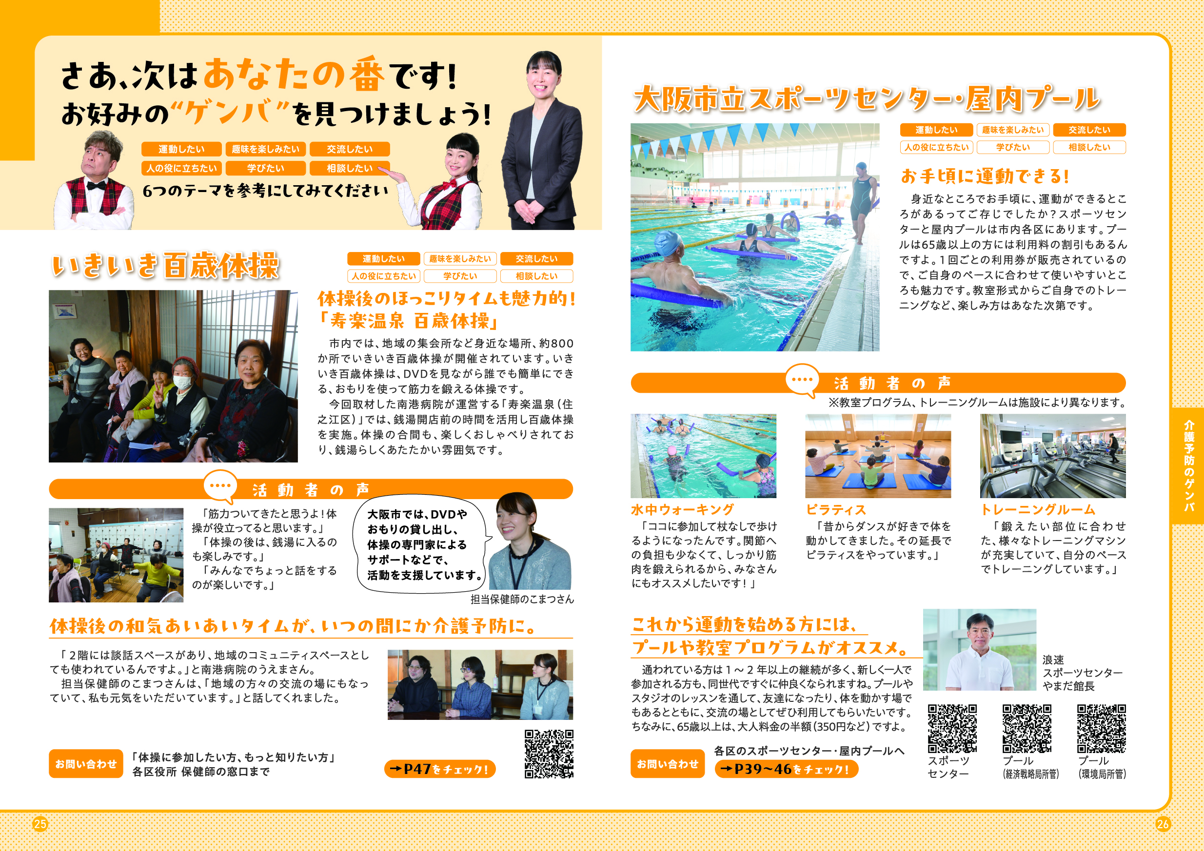 このガイドブックでは、「大阪市介護予防アンバサダー」である吉本新喜劇の内場勝則さんと未知やすえさんが、介護予防についての街角インタビューや、専門家との対談を通じて、介護予防の大切さをわかりやすくご紹介しています。また、皆さんに参加いただける介護予防活動の場もご紹介しています。アンバサダーと一緒に、楽しみながら、ご自身にあった活動を見つけていただき、介護予防について考えていただける内容となっていますので、ぜひ最後までご覧ください。