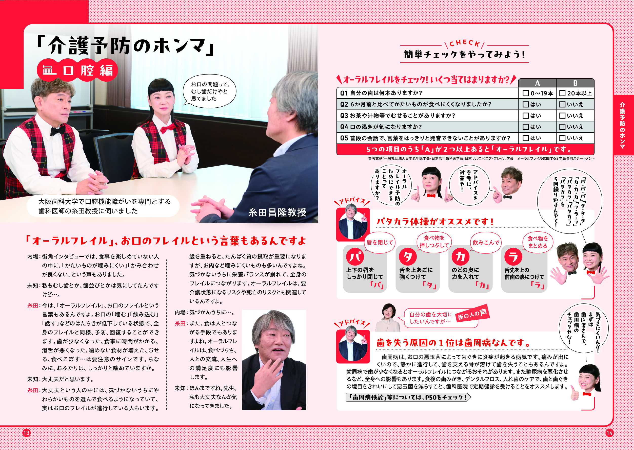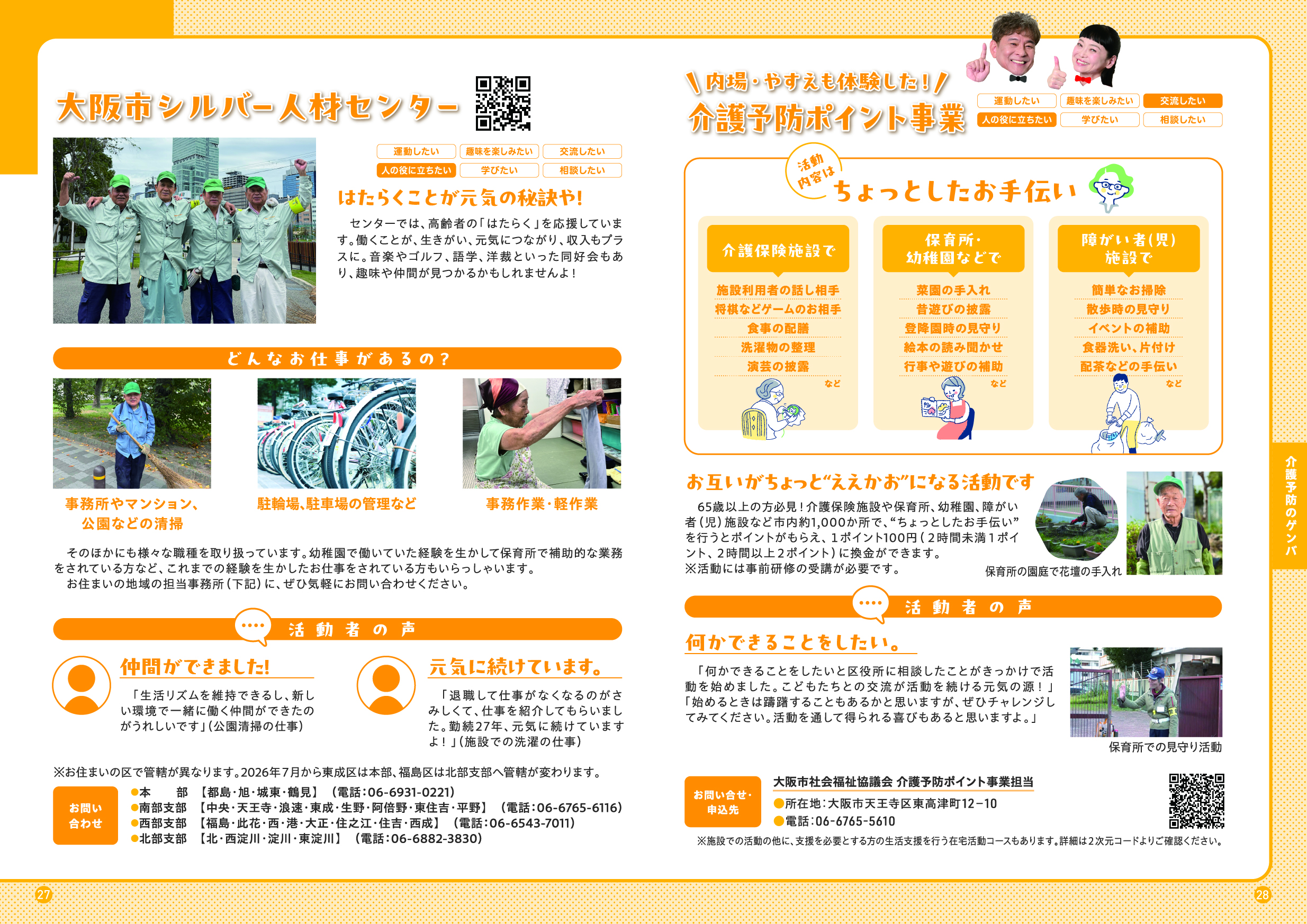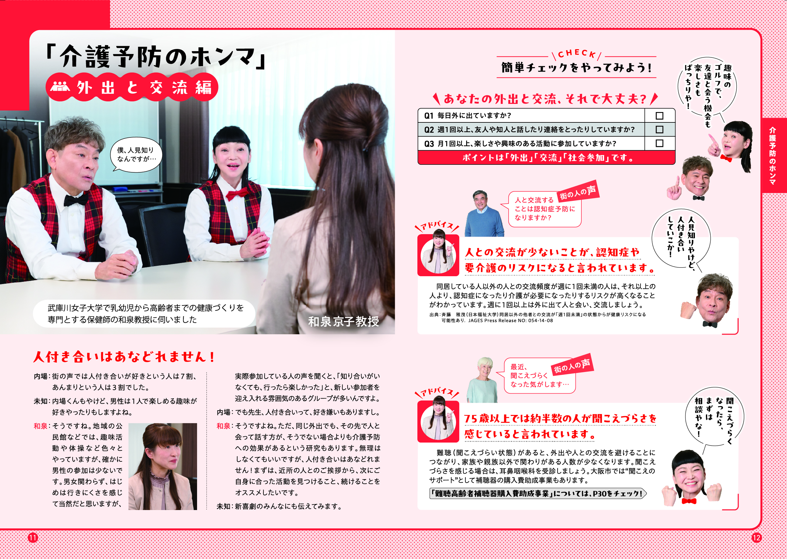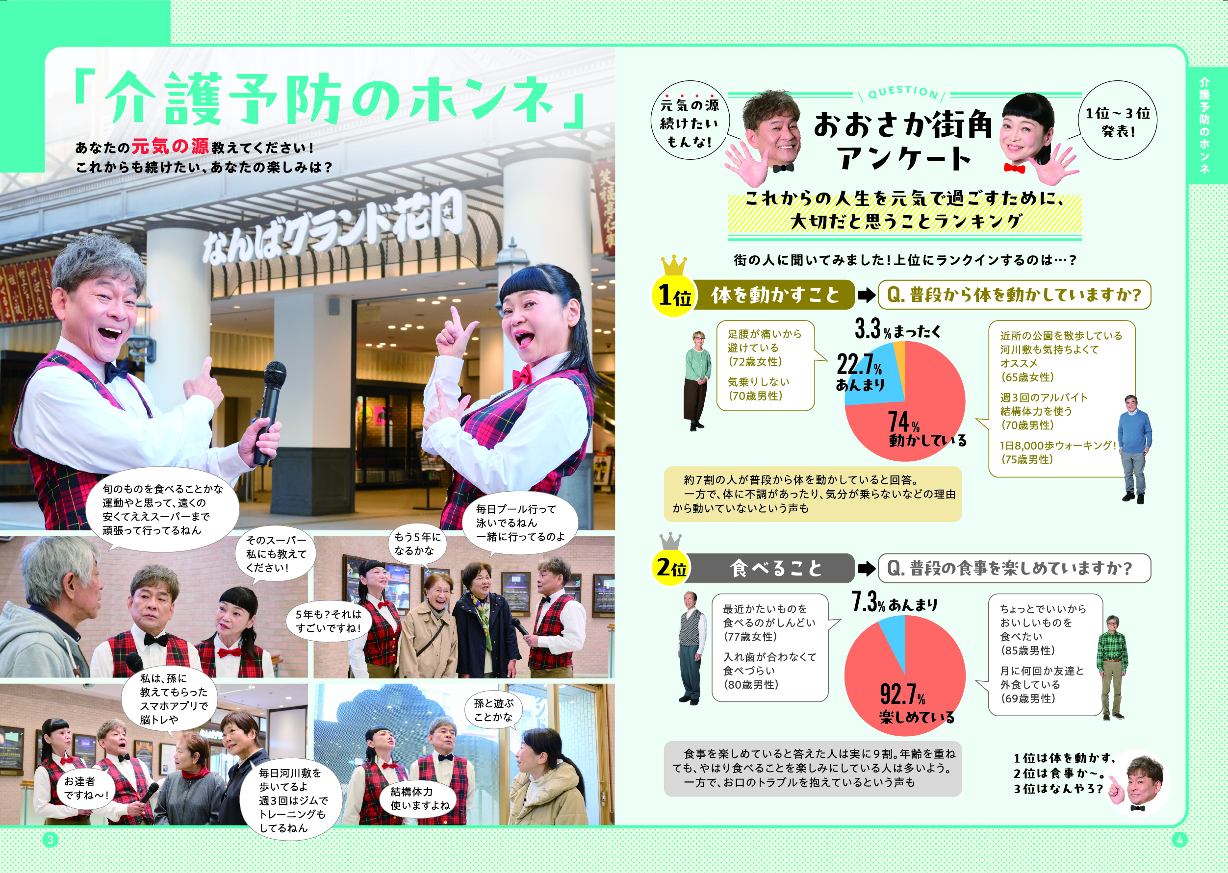このガイドブックでは、「大阪市介護予防アンバサダー」である吉本新喜劇の内場勝則さんと未知やすえさんが、介護予防についての街角インタビューや、専門家との対談を通じて、介護予防の大切さをわかりやすくご紹介しています。また、皆さんに参加いただける介護予防活動の場もご紹介しています。アンバサダーと一緒に、楽しみながら、ご自身にあった活動を見つけていただき、介護予防について考えていただける内容となっていますので、ぜひ最後までご覧ください。