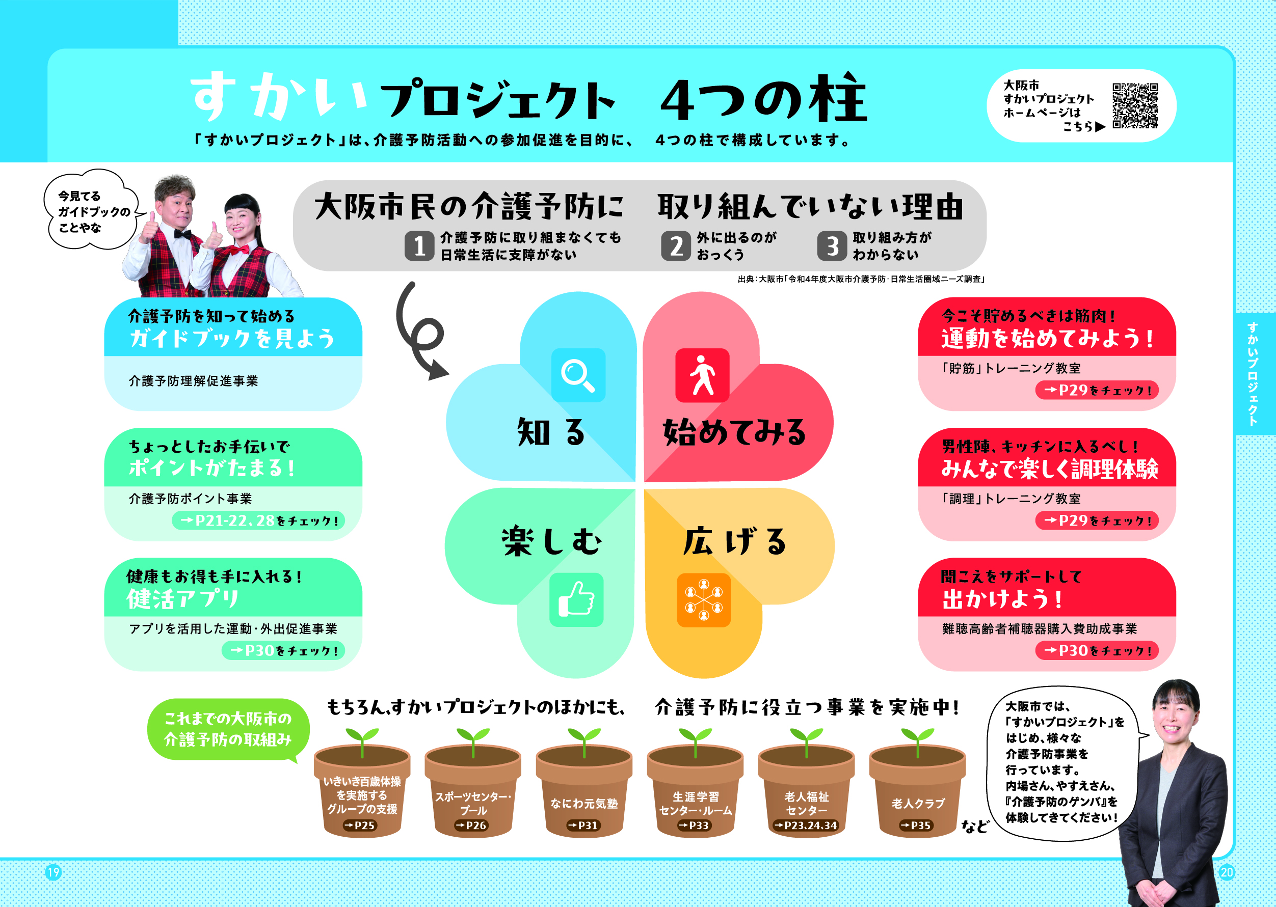 ※このガイドブックは、介護予防の更なる推進<すかいプロジェクト>の4つの柱である「知る」「始めてみる」「楽しむ」「広げる」のうち“介護予防の取組みを「知る」ー知らないと、始まらないー”として行っている、介護予防理解促進事業の一つです。