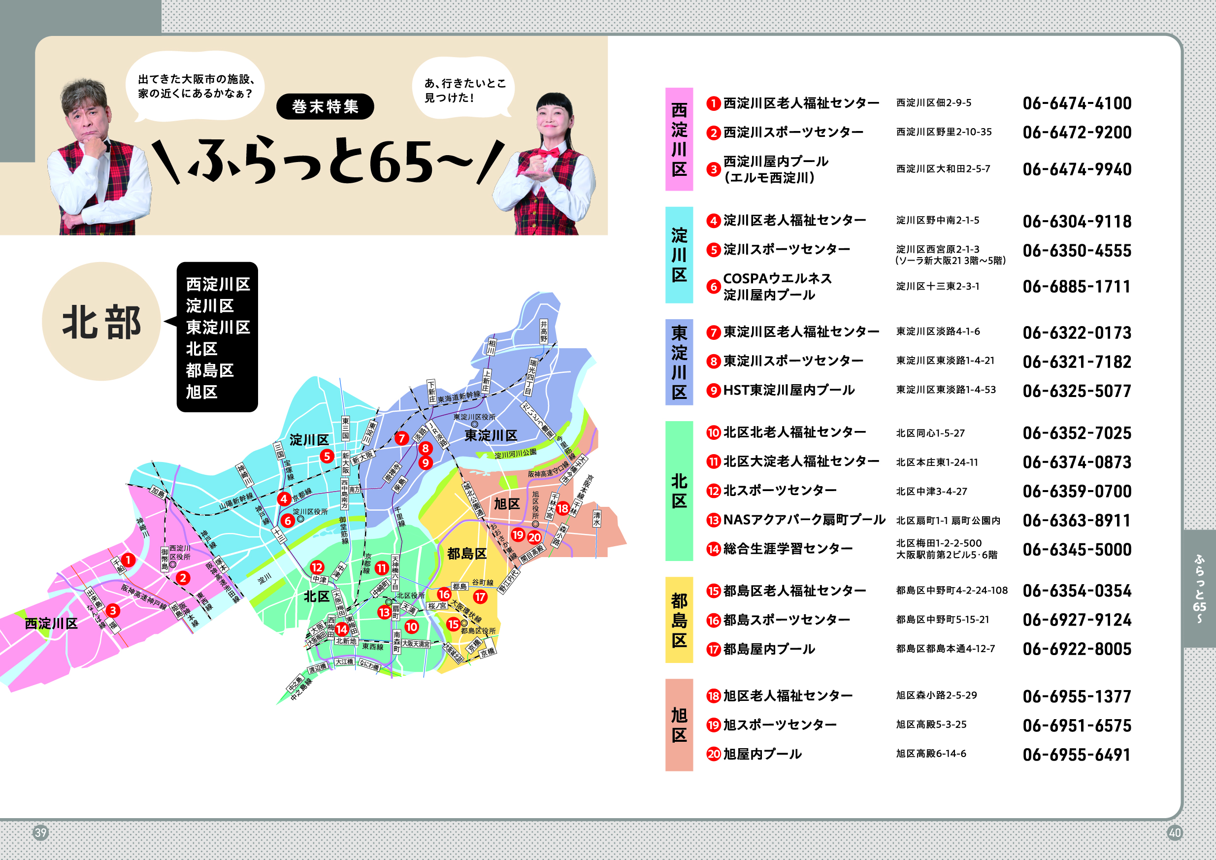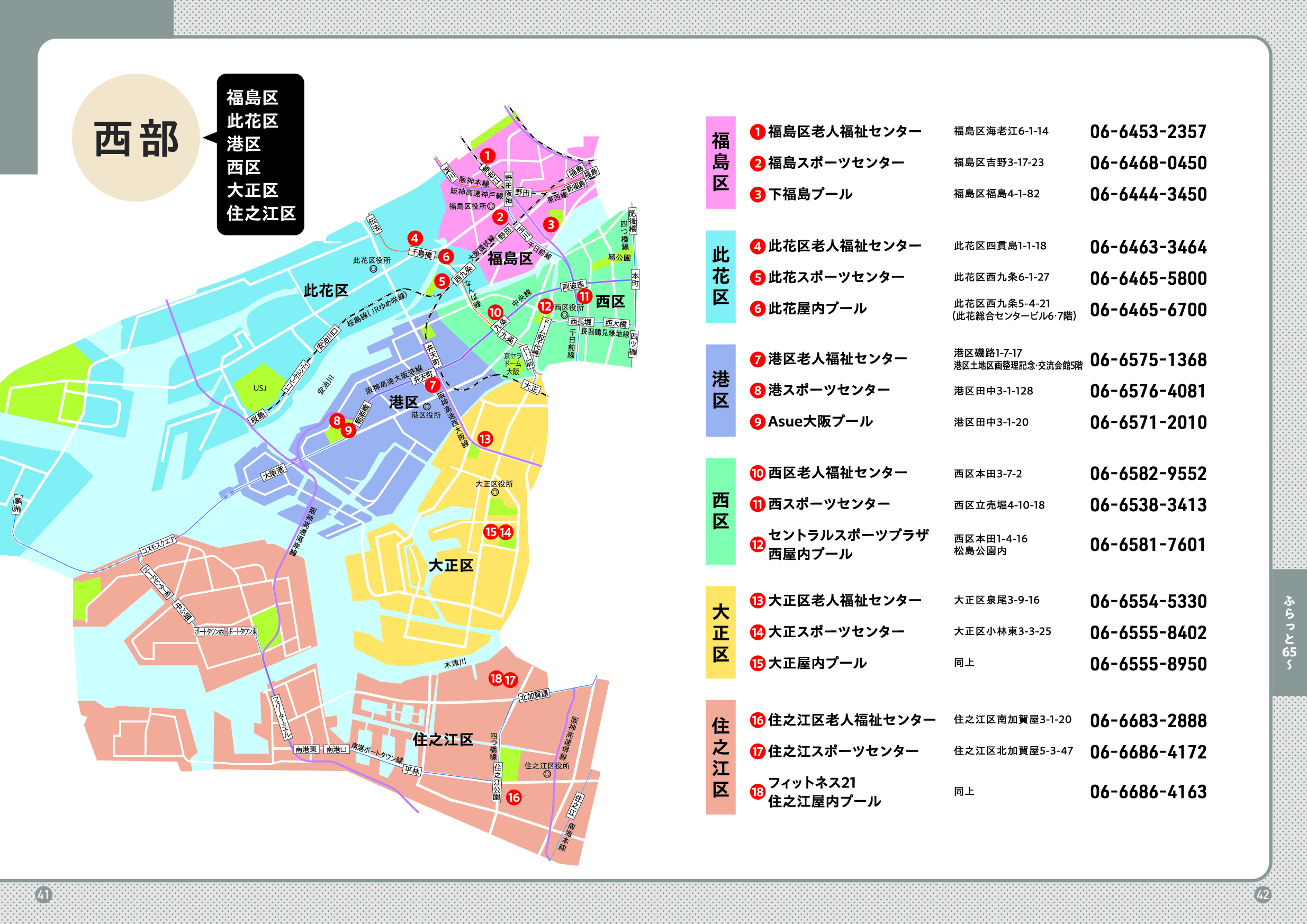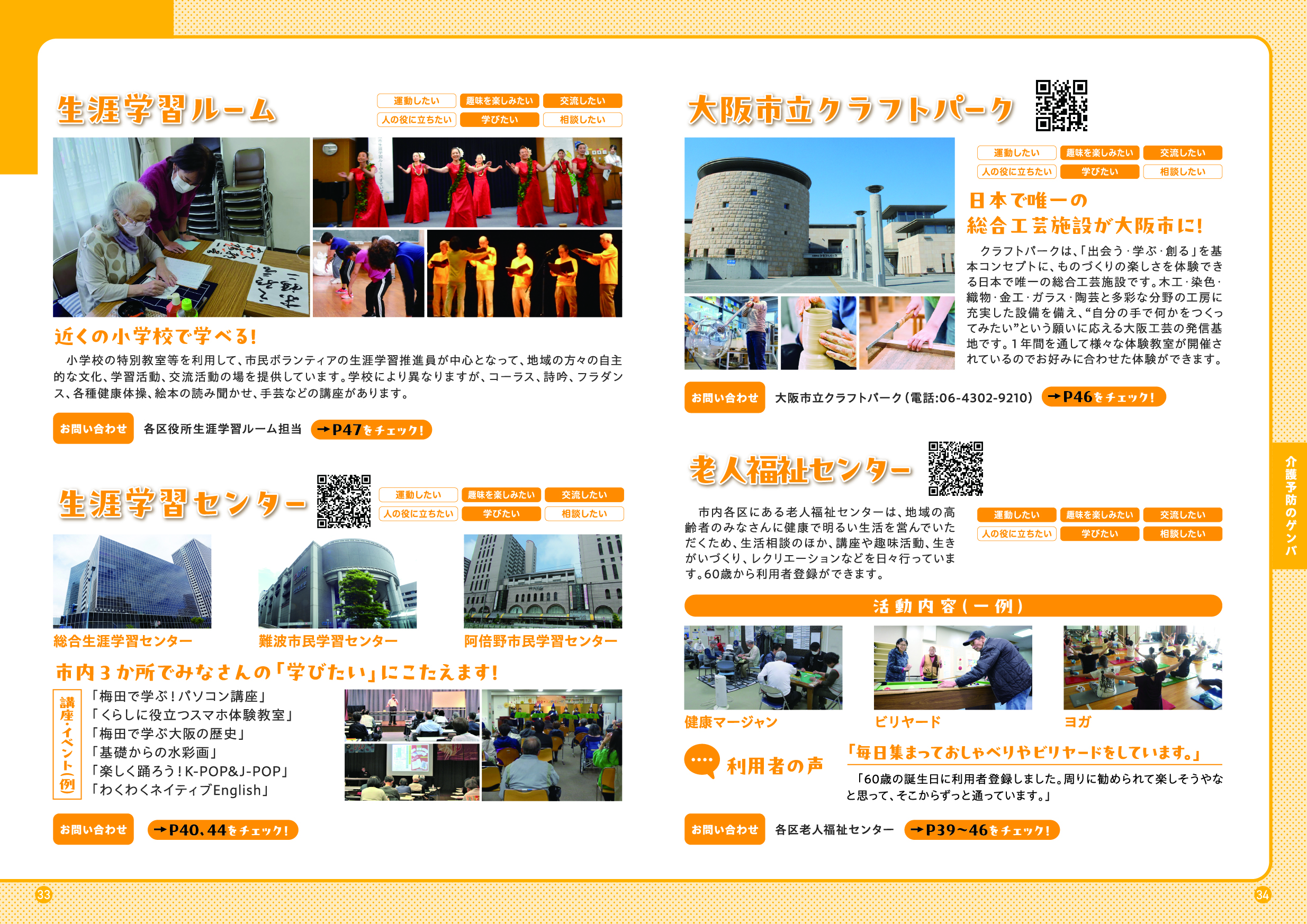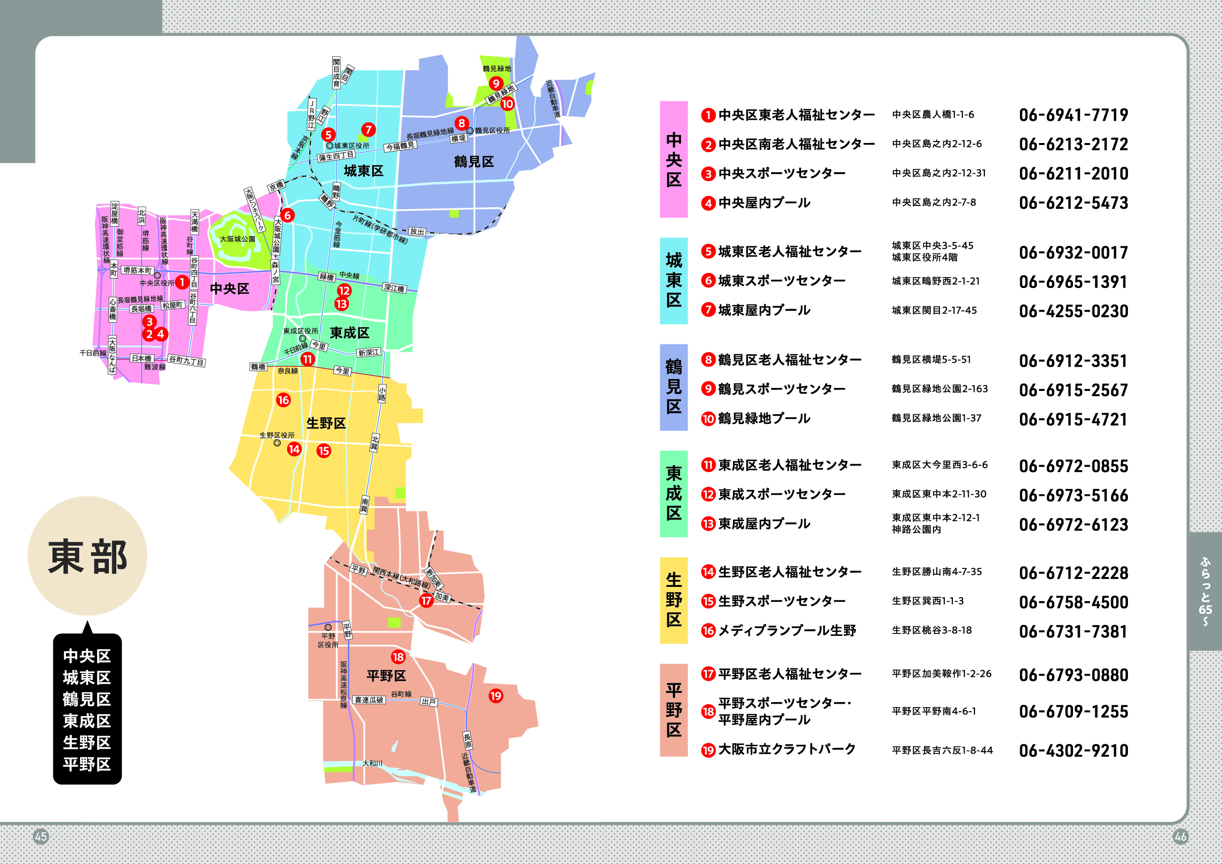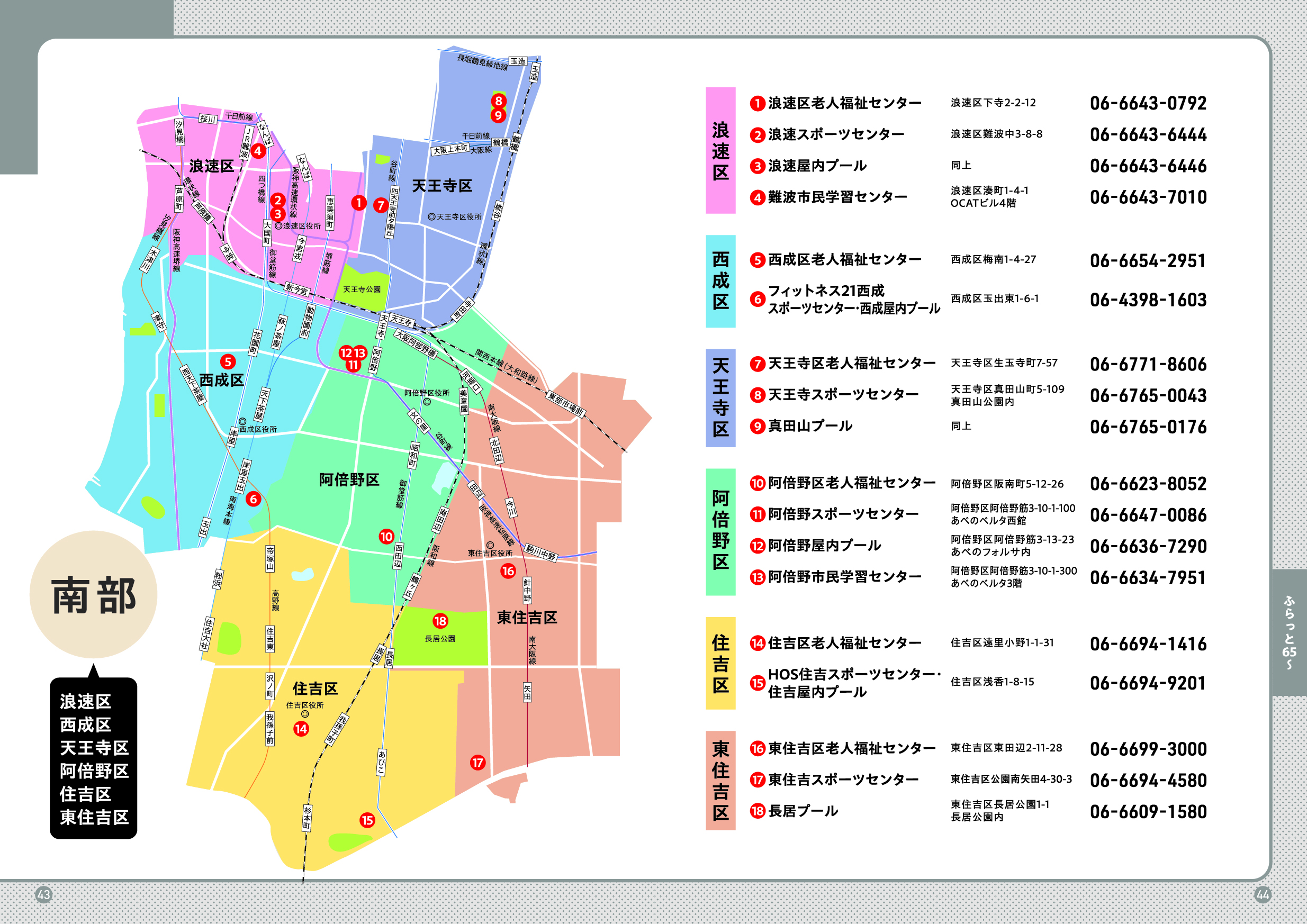 市民情報プラザ(大阪市役所1階)、区役所、地域包括支援センター、総合相談窓口(ブランチ)、大阪市社会福祉協議会、各区社会福祉協議会、老人福祉センター、大阪市立図書館、区民ホール・区民センター・会館、大阪市立スポーツセンター、大阪市立屋内プール、大阪市シルバー人材センター、大阪市立生涯学習センター、大阪市消費者センター、など