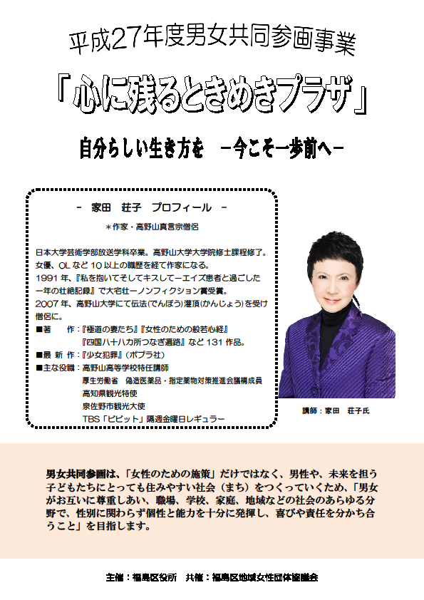 福島区では男女共同参画社会をより多くの方に啓発するため、福島区地域女性団体協議会と共同で、男女共同参画社会をテーマにした講演会「心に残るときめきプラザ」を開催しています。
