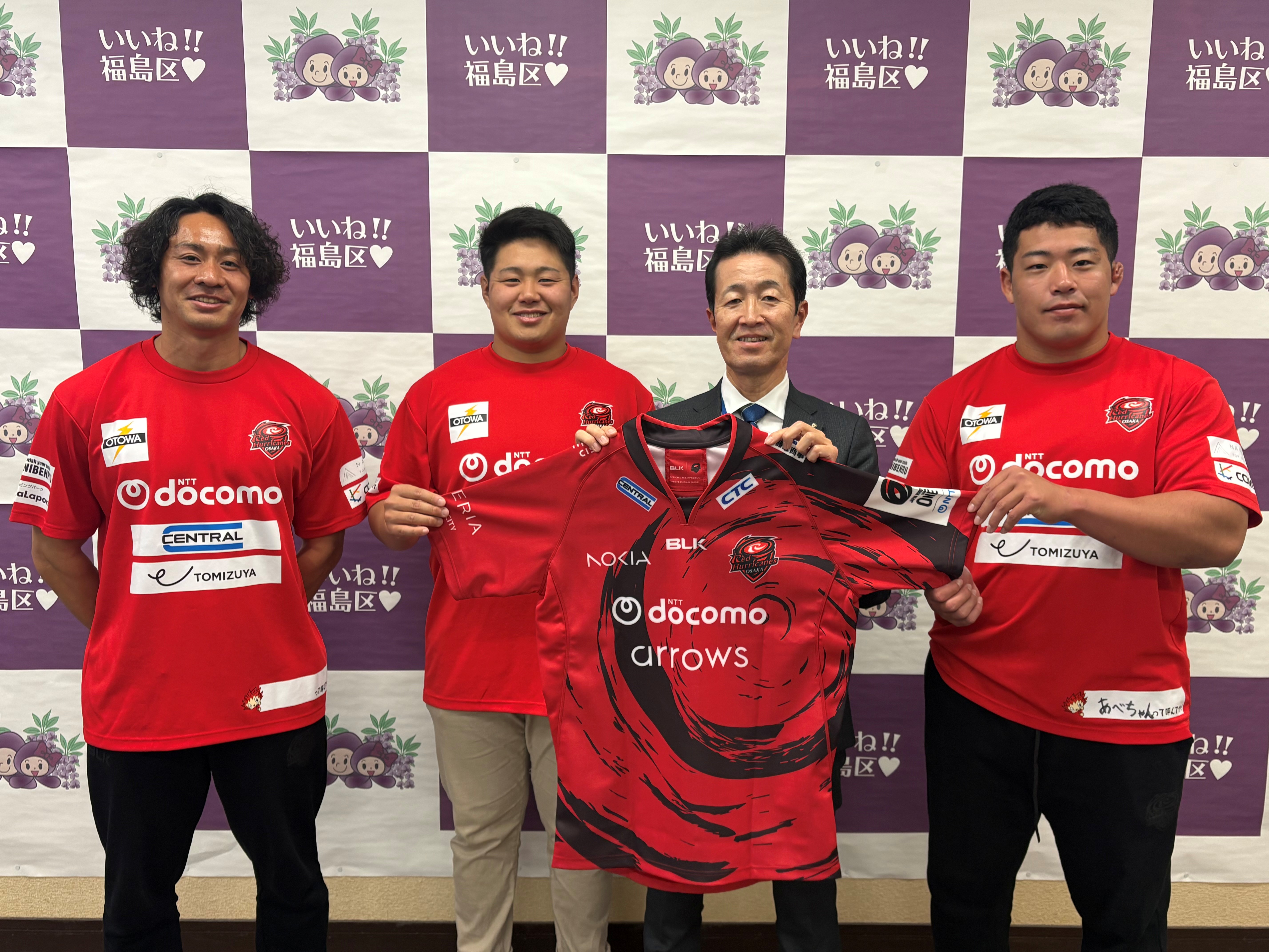 令和8年2月19日(木曜日)、福島区と連携協力に関する協定を締結しているレッドハリケーンズ大阪の福島区民アンバサダーの深澤 翔祐選手、山本 貫太選手、安部 駿亮選手が区役所を訪問され、昨シーズンに引き続き「福島区」と印字されたジャージを寄贈いただきました。