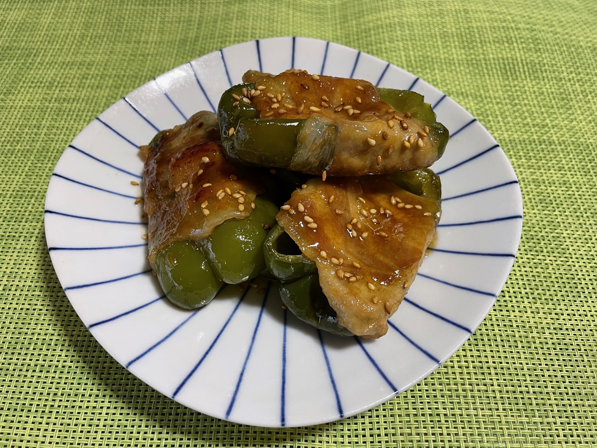 ピーマンは縦半分に切り、種は残してヘタを取り除く。豚肉1枚を広げ、ピーマン2分の1個をのせ、くるくると巻き、小麦粉をまぶす。