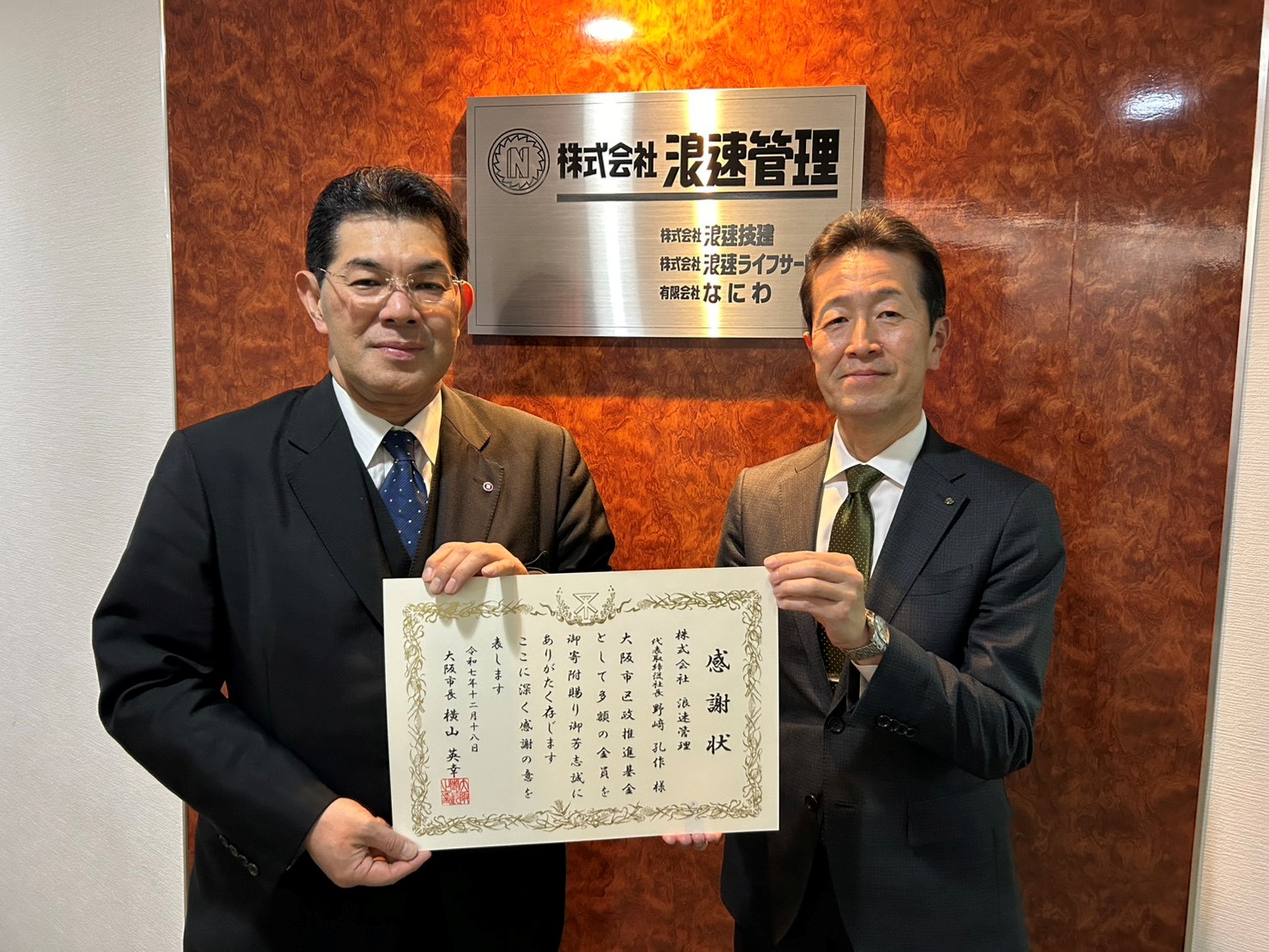 福島区鷺洲の株式会社浪速管理様から区政推進基金としてご寄附をいただきました。いただいた寄附金は、福島区政に活用させていただきます。ありがとうございました。