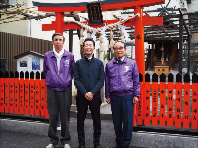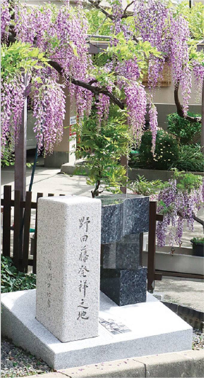 フジの花(ツルは右巻き)は青森から九州まで各地で見ることができますが、古来、フジの名所として語 り継がれてきた野田村、現在の玉川の春日神社に自生していたフジが「野田の藤」と呼ばれていたことから、1911年に植物学者・牧野富太郎博士が日本のフジの標準和名を「ノダフジ」と命名し、現在に至ってい ます。春日神社を訪問しますと、神社総代の藤さん、「のだふじ」の育成活動にご尽力いただいている「のだふじの会」会長の後藤さんに迎えていただきました。 春日神社は奈良春日大社の分社と考えられ、野田村の庄屋であった藤家の氏神として祭られ、現在は祠と「野田の藤跡」の歌碑、藤棚などがあり、 フジの開花を待ち構えています。隣接する史料室では、貴重な絵図や資料を通じて、先人たちのかかわりを学ばせていただきました。 日頃より、丹精込めて育てられた「のだふじ」が美しく咲き誇ります。ぜひお越しください。