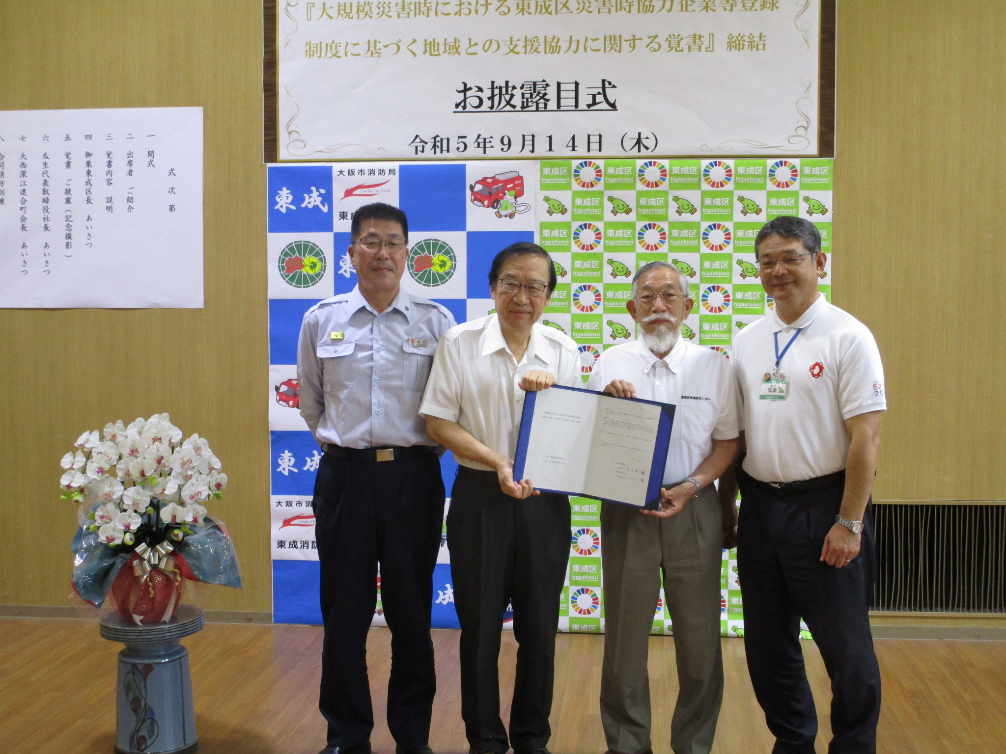 令和5年9月14日午後2時から、東成消防署にて協定書のお披露目式が開催されました。