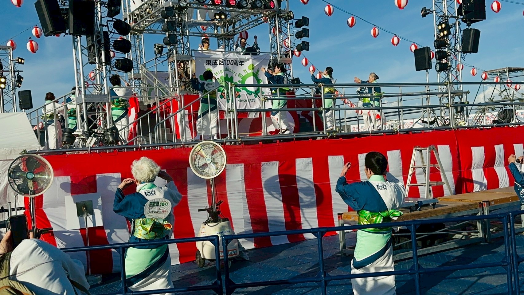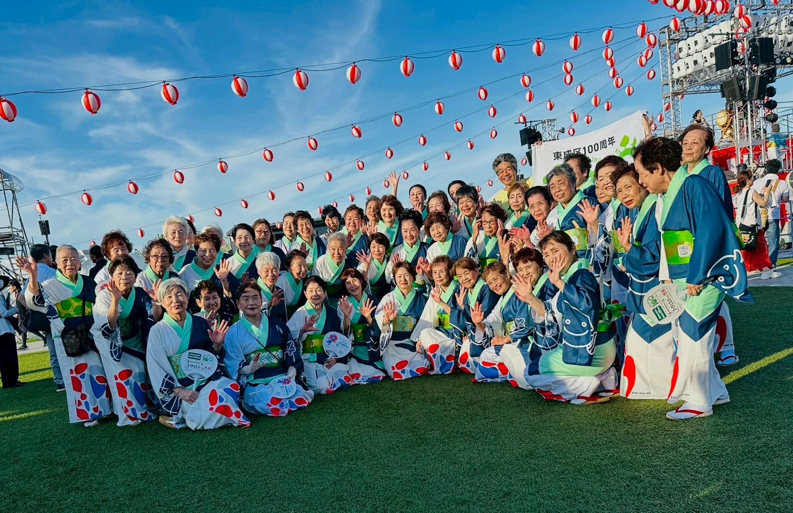 交流盆踊りには、区長も参加し、東成区100周年の旗とともに盆踊りを盛り上げました!