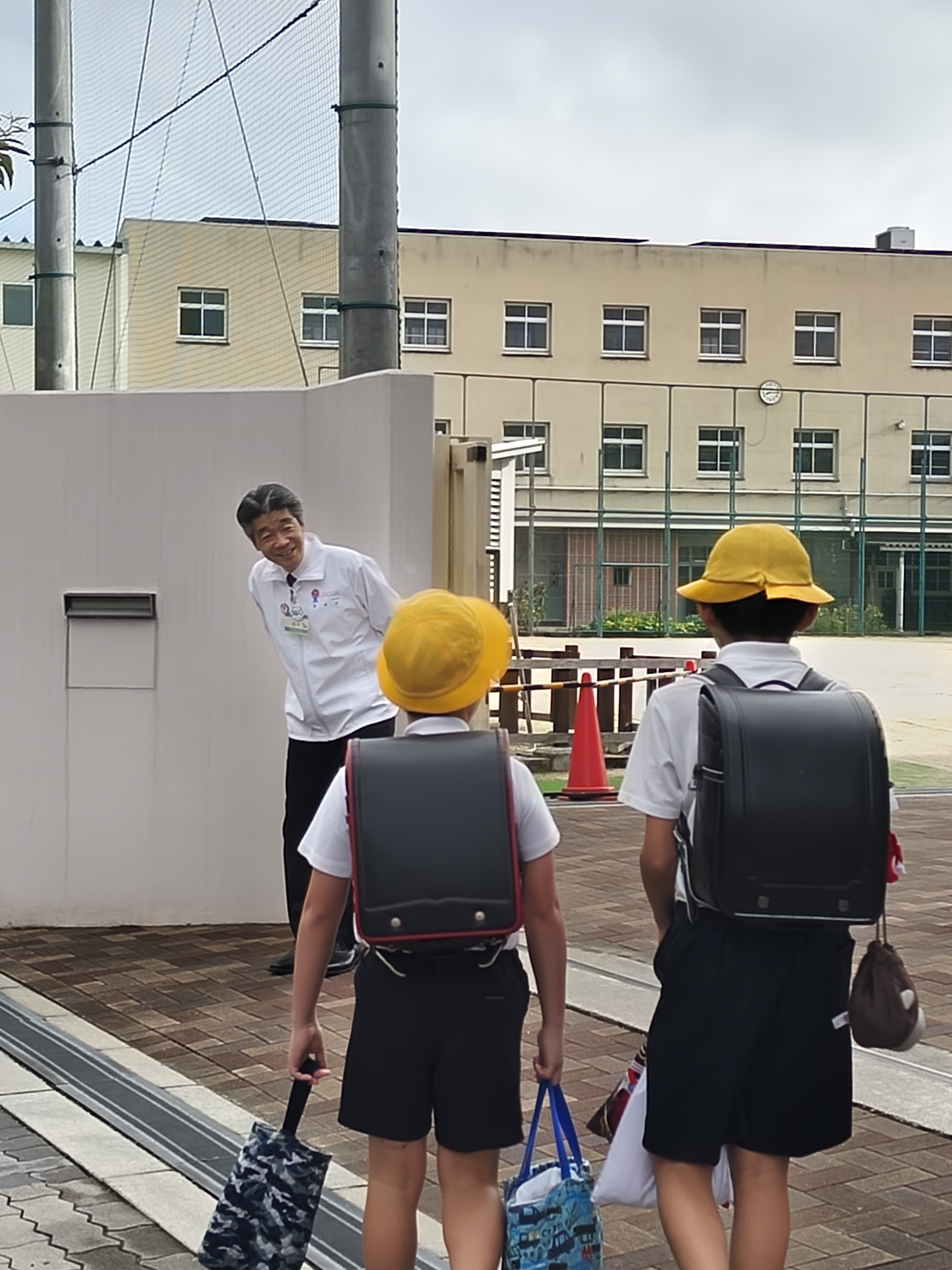 まずは校門でのあいさつ。月曜日、みんな元気にあいさつをして登校されていましたよ。