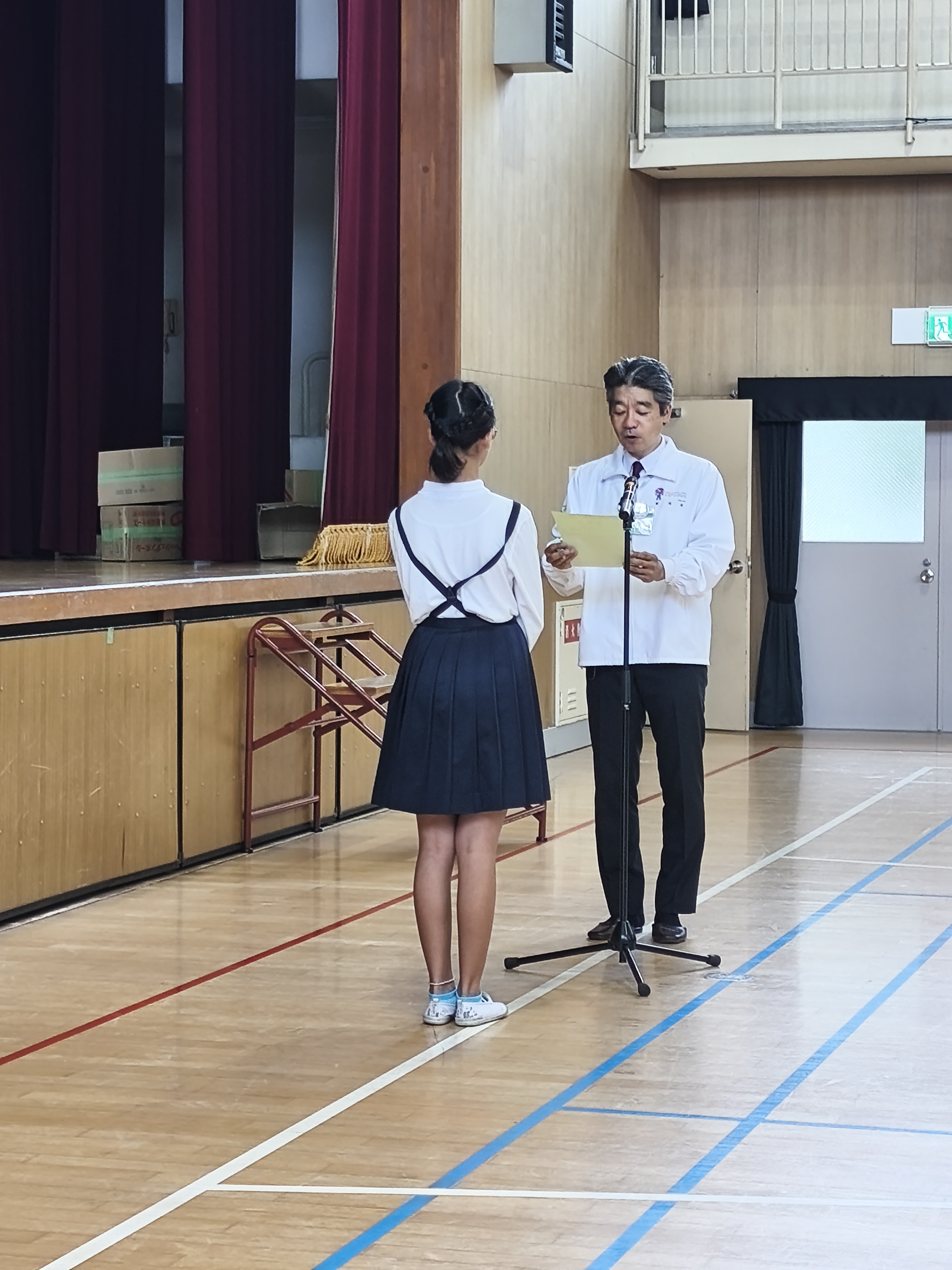 続いて全校朝礼で代表者に表彰状手渡し。秋は表彰対象が10%超の5校にお伺いします。二次締切で全部の小学校に行けたらいいな、と思っています。