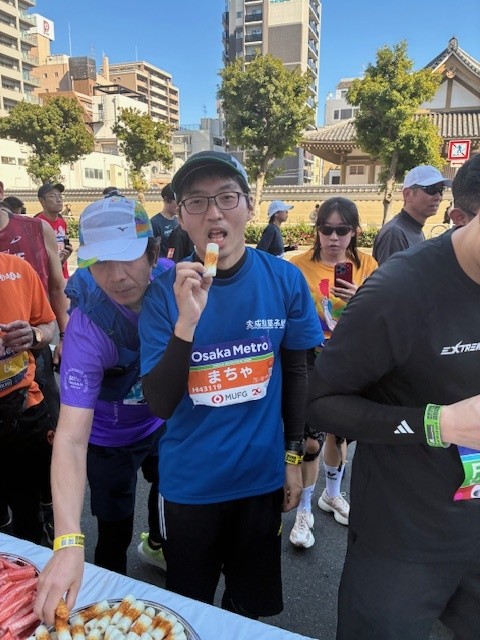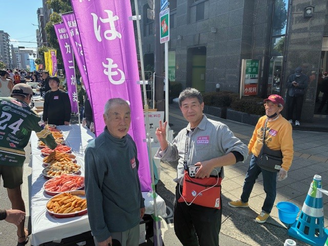 商店街の皆さんが用意してくださった「はもてん・はもちく・カニかま」で、東成区のランナーへもたくさんエールを送ることができました。