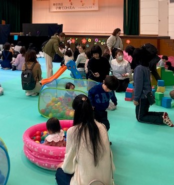 区民ホールでは人形劇や体操のイベントや、ゲームなどの遊び、おもちゃ病院、会議室では絵本や読み聞かせ、こども服のリユースや計測と、色々なブースの好きなところを行き来して、好きな遊びを楽しむ可愛い姿があちらこちらで見られ、微笑ましいひと時でした。
