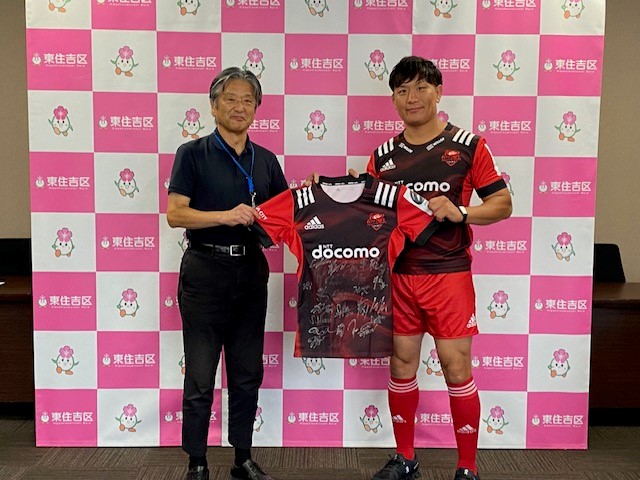 令和5年5月23日(火曜日)、東住吉区と連携協定を締結しているラグビーチーム、NTTドコモレッドハリケーンズ大阪がご来庁されました。