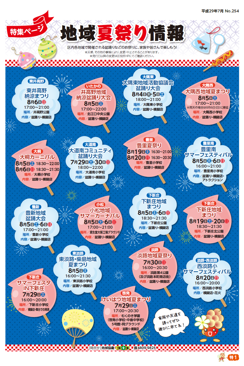 お詫び…特集1面の「地域夏祭り情報」の淡路地域夏祭りについて、時間が16:00~20:30、場所が淡路第4公園と誤表記がありました。正しくは、『17:00~21:30』、『淡路4公園』です。深くお詫び申し上げます。