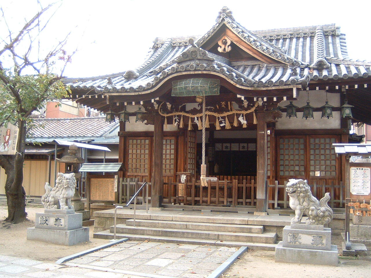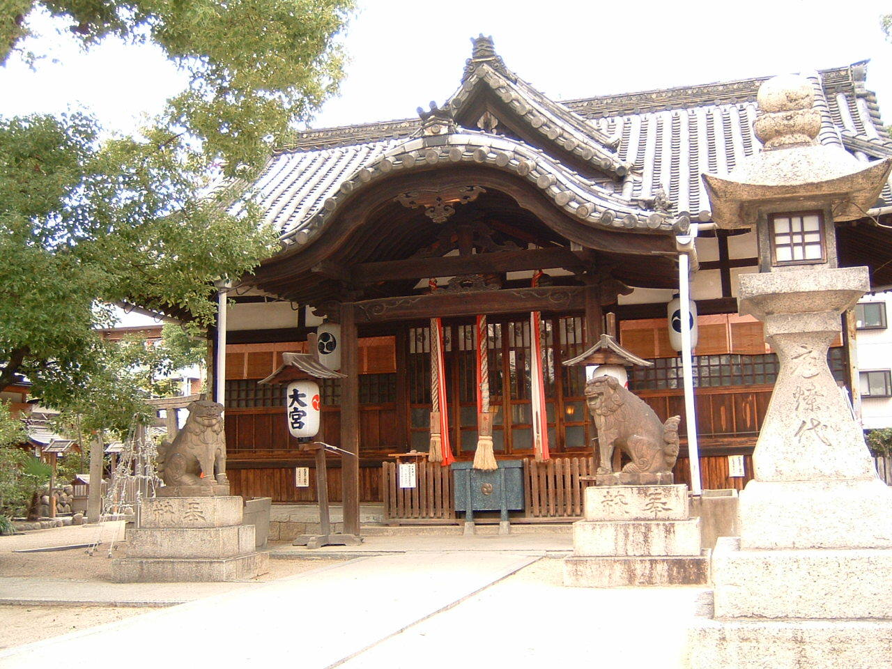 境内には、江戸時代の神燈や水鉢などがありますが、ひときわ目をひくのは樹齢約400年といわれている楠の大樹です(高さ23.9メートル、幹周り4.6メートルで昭和43年10月1日指定の大阪市保存樹)。現在の社殿は、昭和43年に再建されたものです。