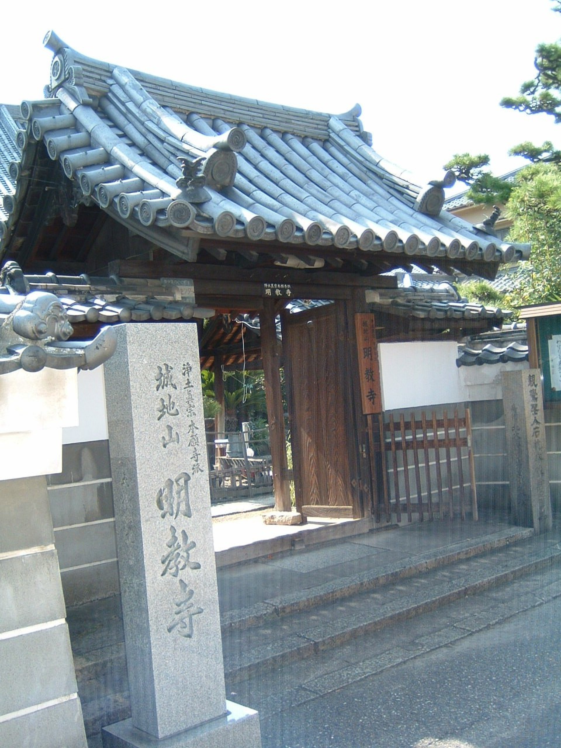 浄土真宗本願寺派、本尊阿弥陀如来。文明9年(1477年)、本願寺第8代宗主蓮如上人の教化を受けた直弟子釋教誓(しゃくきょうせい)が開基となり、文明16年(1484)に創建しました。明教寺の山号は「城地(じょうち)山」と号し、豊臣秀吉の臣であった中川清兵衛清秀がこの地に本丸を有した城を築いたことが『新庄村明細帳』・『明教寺就御尋奉書上由緒書』などに記されています。また、この地に新しい城を築いたことから、「新城」と称するようになり、のちに「新庄」という地名に転じ、元禄年間に上新庄と下新庄に二分されたといわれています。