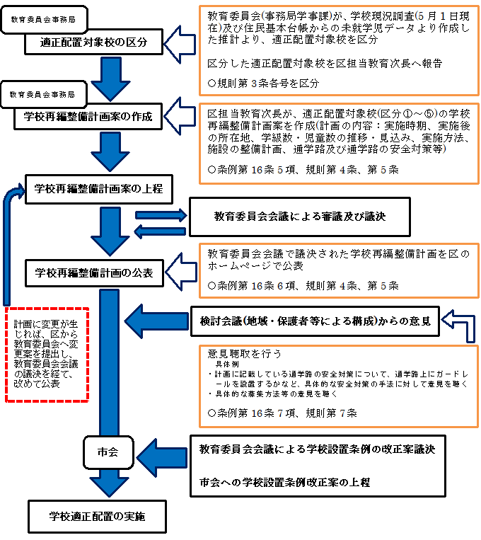 - 教育委員会事務局より示される毎年5月1日現在の学校現況調査、住民基本台帳等を勘案し、小学校は適正配置対象校(区分1~5)となった学校、中学校は適正配置対象校又は6~8学級校となった学校が所在する区の区担当教育次長が学校再編整備計画(以下、「計画」という。)案を作成する。