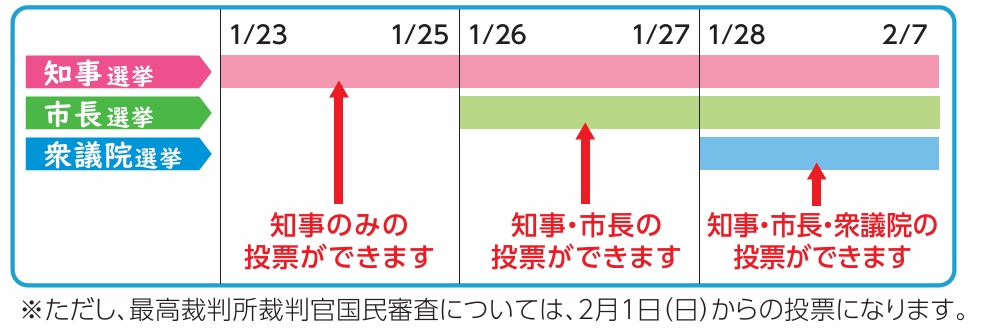 選挙の種類により、期日前投票・不在者投票期間が異なります