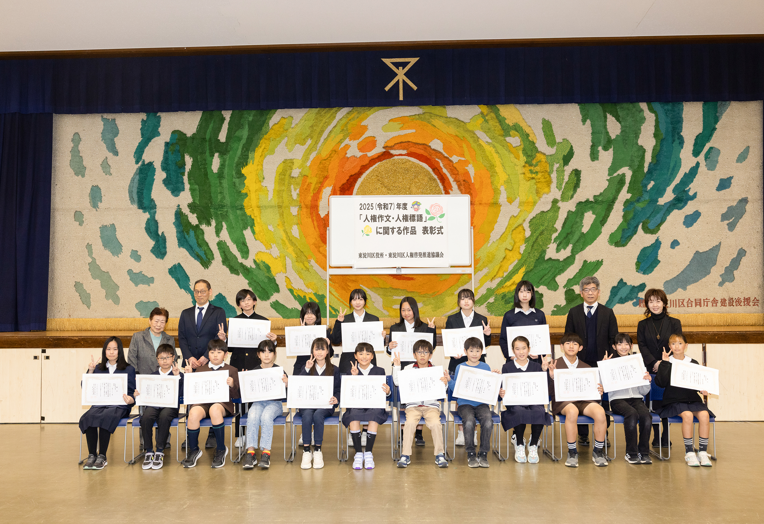 人権啓発推進事業の一環として、区内小・中学校に人権作文及び人権標語を募集し、各学校の代表作品を区役所3階区民ホール前に展示しました(令和7年12月4日から12月25日まで)。