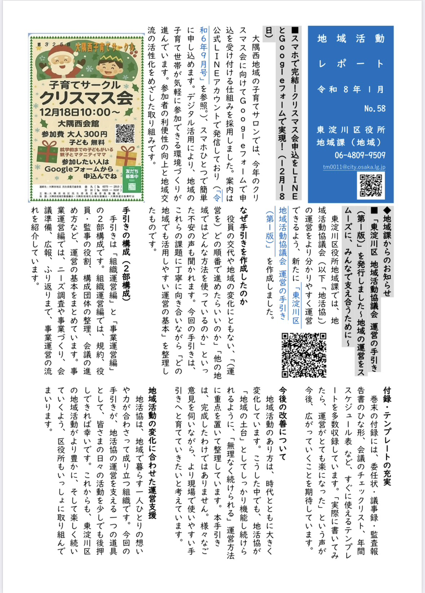 地域課からのお知らせとして、「『東淀川区 地域活動協議会 運営の手引き(第1版)』を発行しました~地域の運営をスムーズに、みんなで支え合うために~」です。