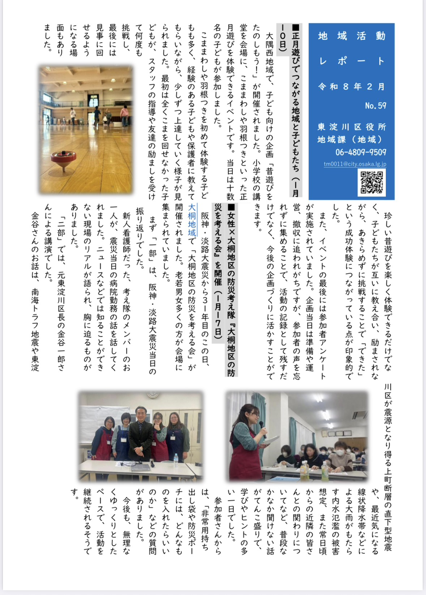 2月号は、「正月遊びでつながる地域と子どもたち」と、「女性×大桐地区の防災考え隊『大桐地区の防災を考える会』を開催」です。