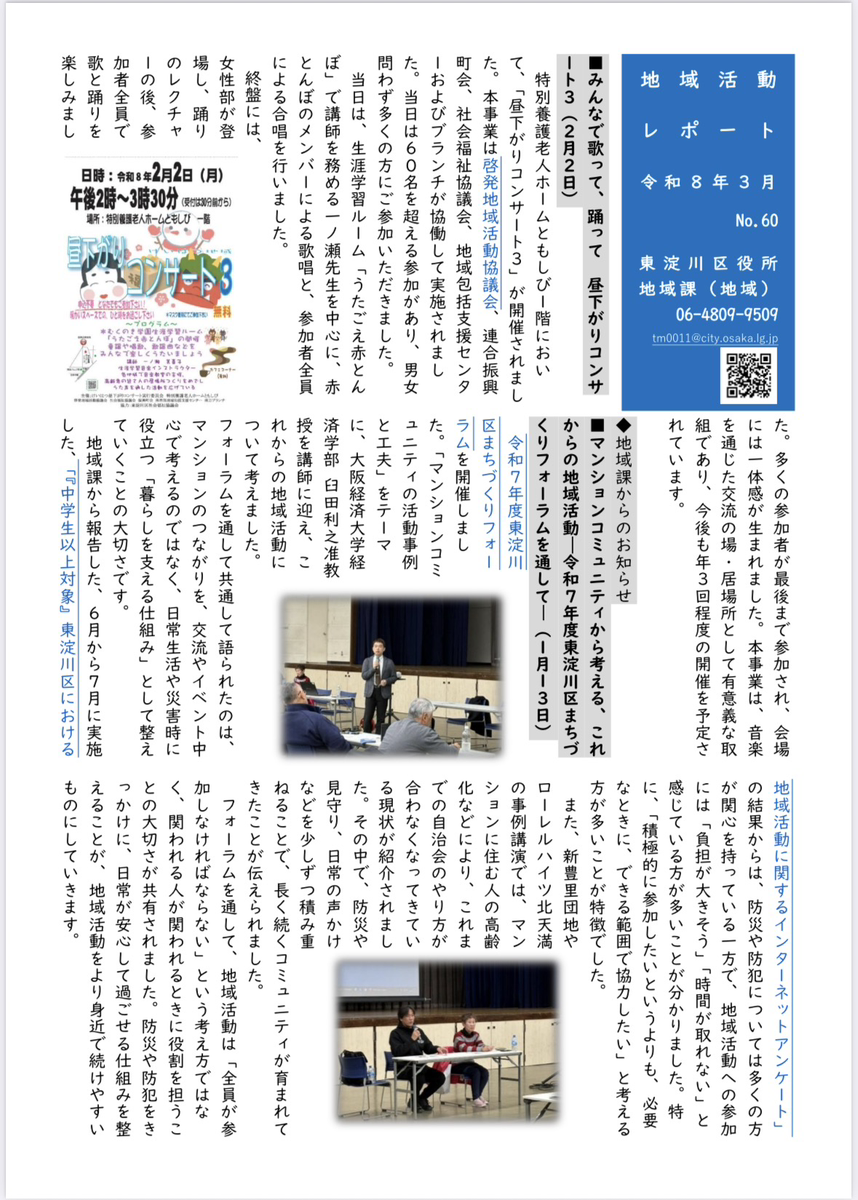 3月号は、音楽でつながる地域のひととき「みんなで歌って、踊って 昼下がりコンサート3」と、マンションコミュニティの事例からこれからの地域活動を考える「令和7年度東淀川区まちづくりフォーラム」の様子をお届けします。